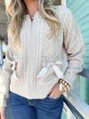 Sweet meets sophisticated in this cozy cream cardigan, featuring delicate bow accents on the front pockets for a feminine touch. With its soft knit texture and classic fit, it's the perfect layering piece to elevate your everyday look with a hint of charm.