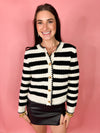 This chic black and white striped cardigan features a timeless design accented with elegant gold buttons for a touch of sophistication. The classic color combination makes it easy to style, while the soft knit fabric offers both comfort and versatility. Perfect for layering over your favorite blouse or dress, or wearing by itself. This cardigan adds a polished finish to any outfit—from casual days to evenings out.