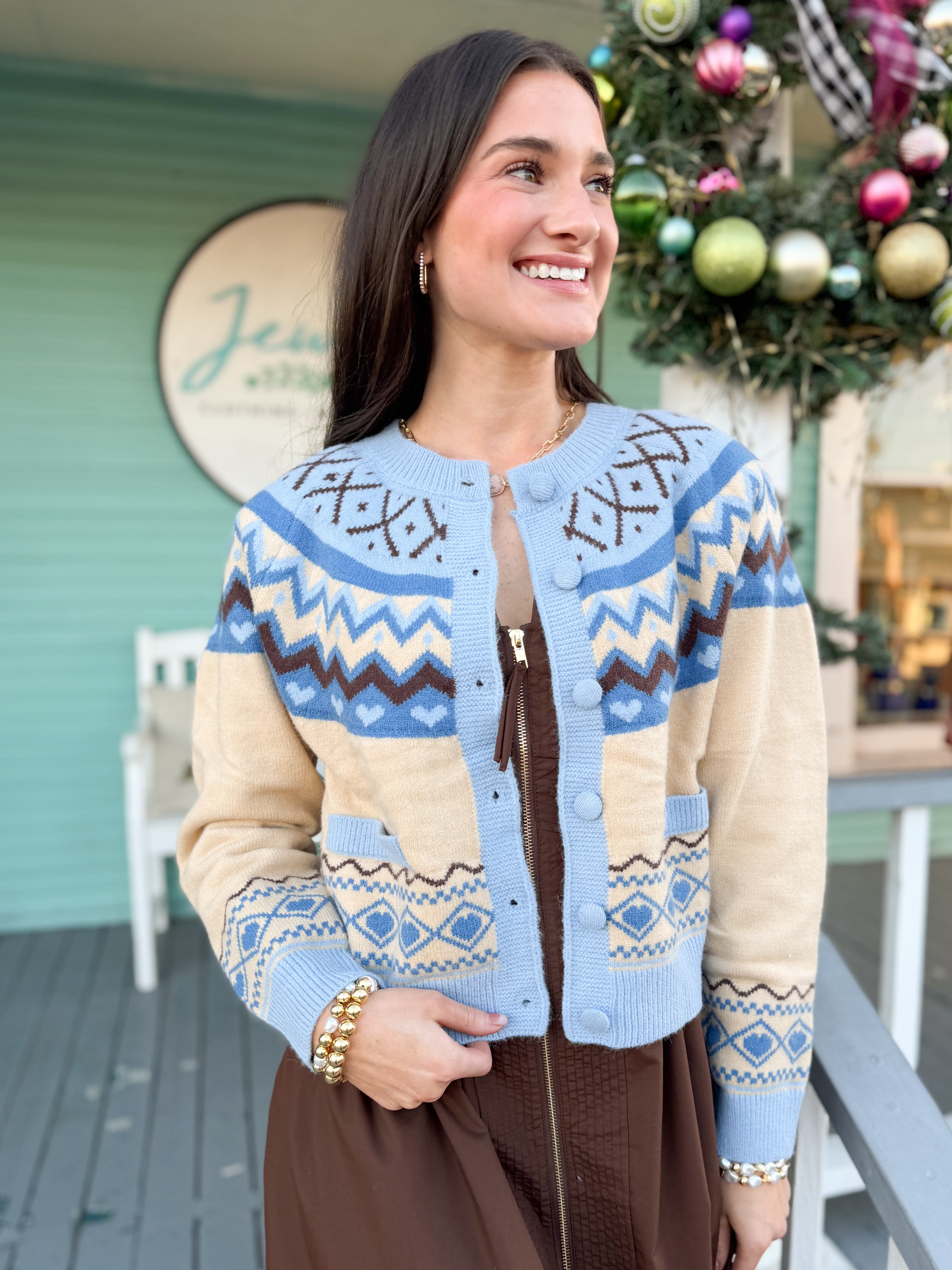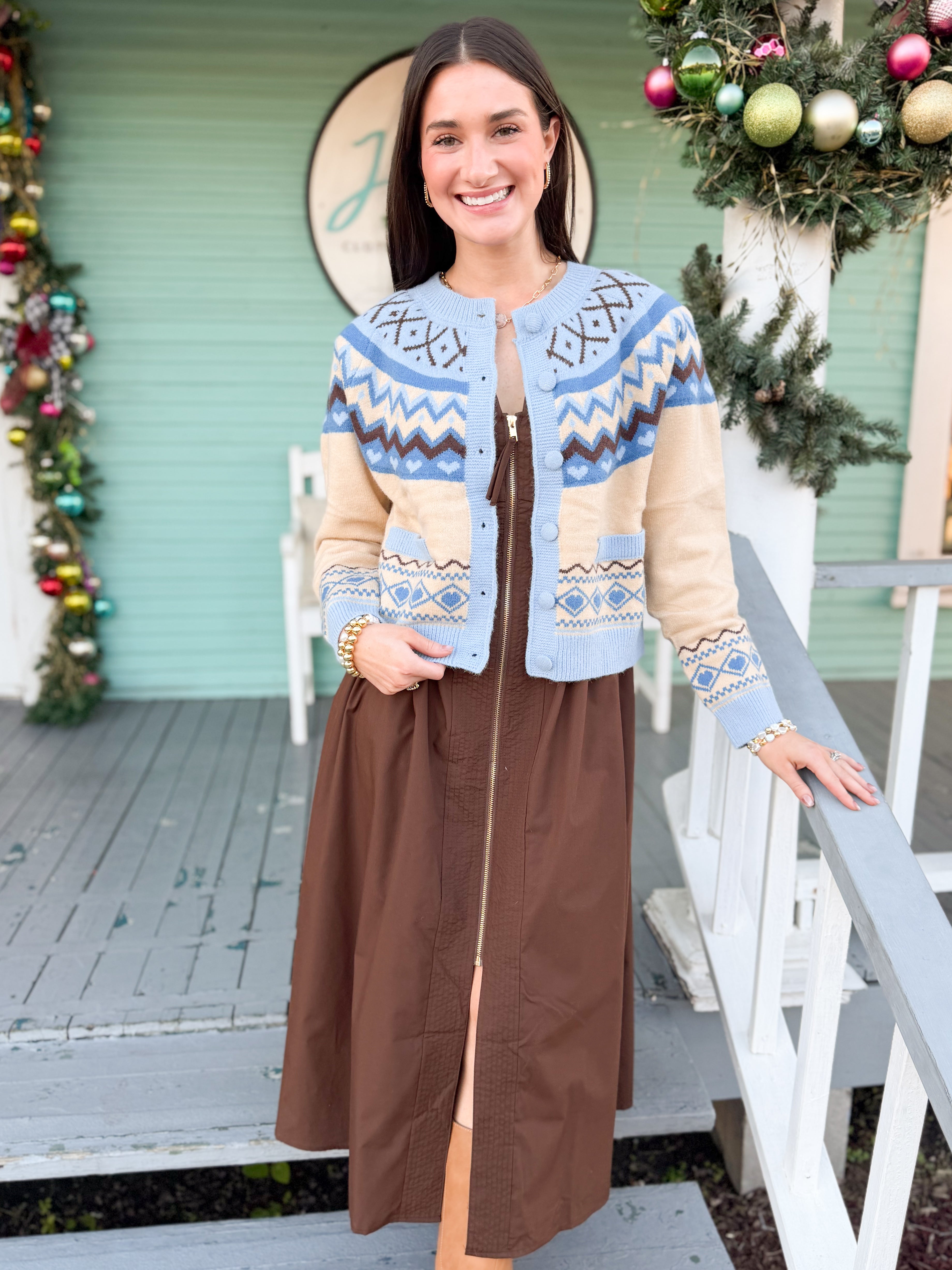 Cozy, cute, and full of charm! This button-down sweater features a playful blue and brown heart pattern, adding a fun pop of personality to your everyday outfits. Soft, warm, and easy to layer, it’s perfect for coffee dates, weekend errands, or casual office days. Styled with the Bowman Zip Midi.
