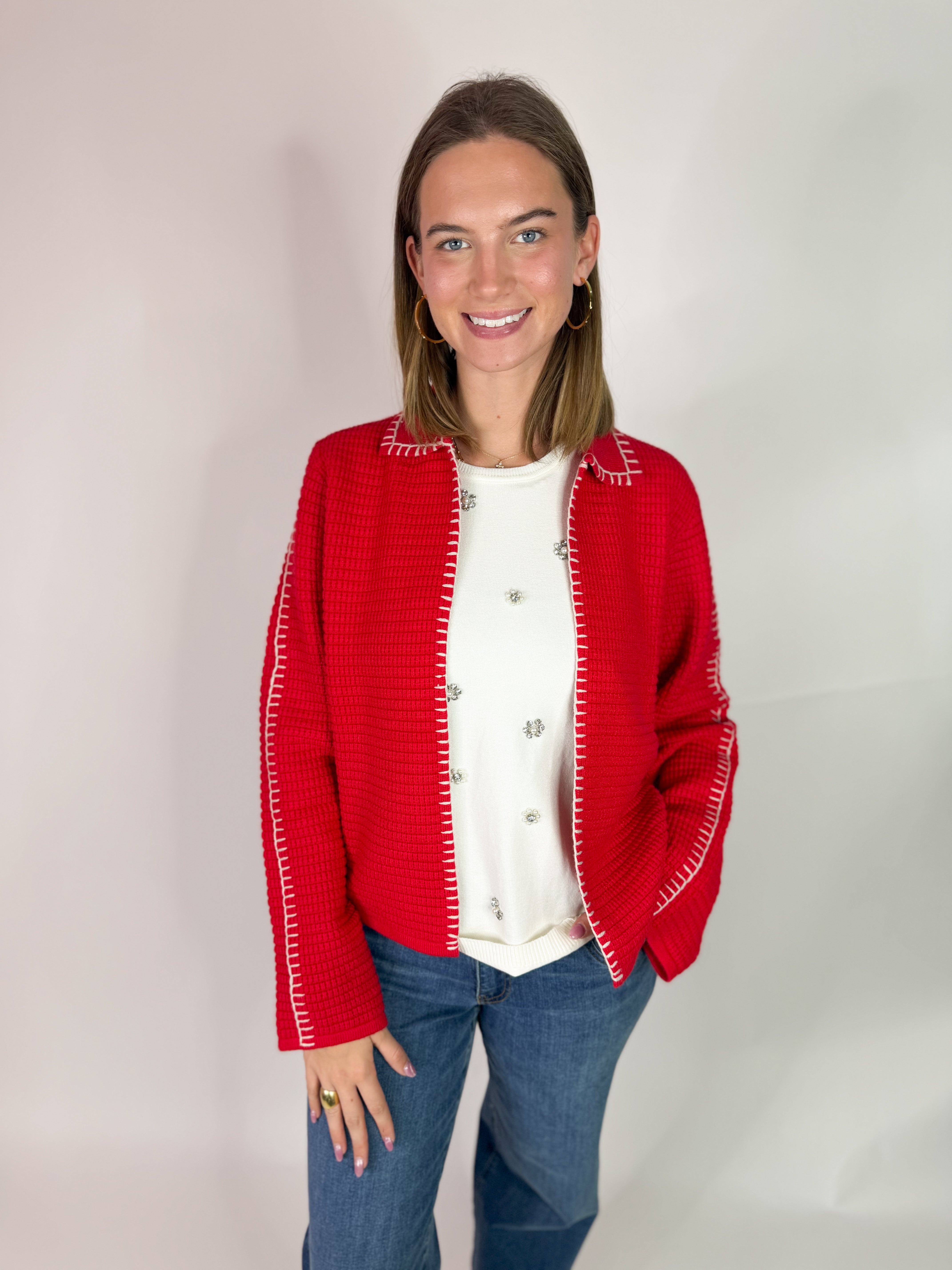 This Red Knitted Cardigan is finished with crisp white stitching for a timeless, eye-catching detail. Cozy yet polished, it’s the perfect layering piece for everyday wear or seasonal styling.