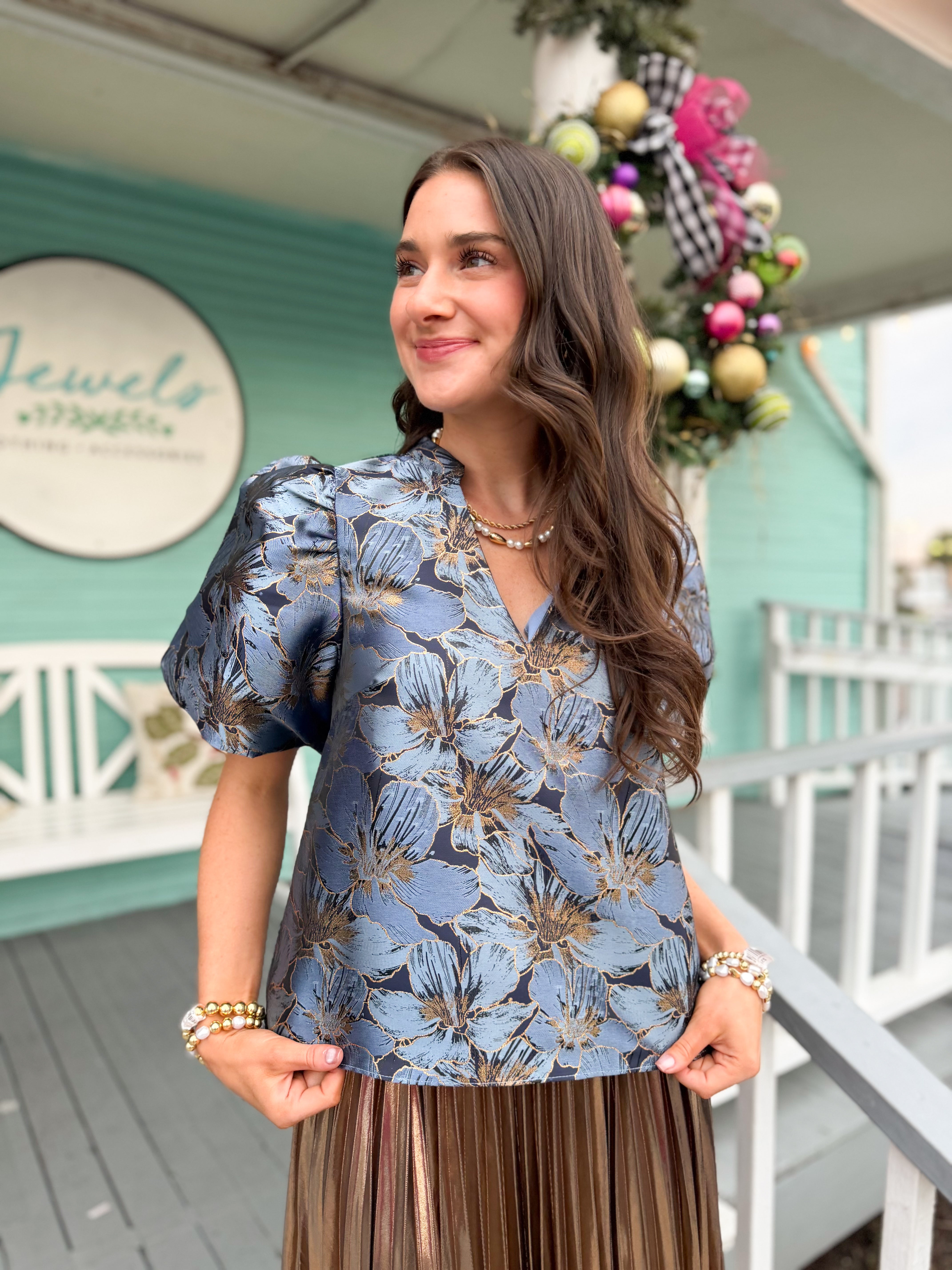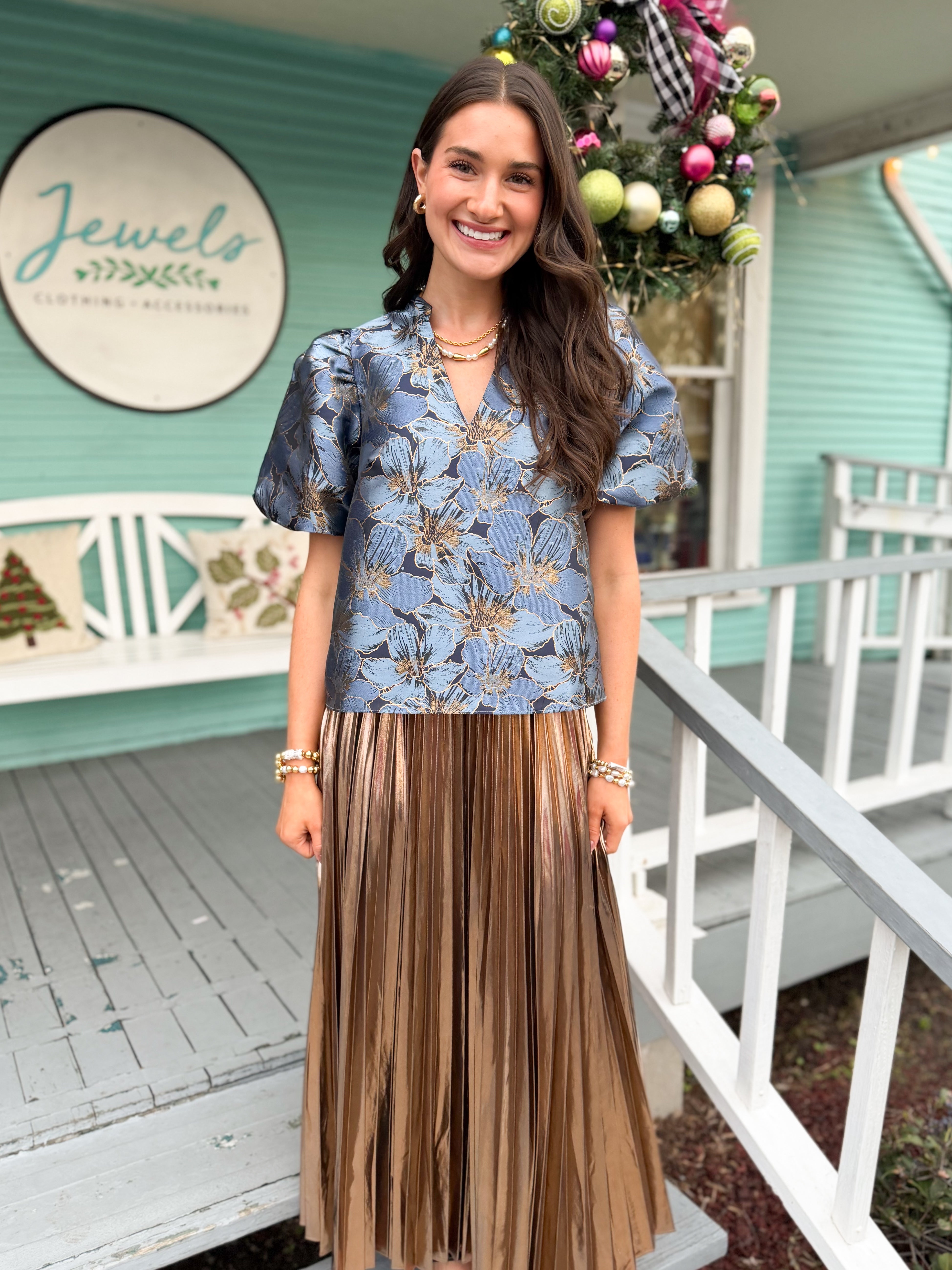 A gorgeous blue shimmer top featuring puff sleeves and a soft, feminine V-neckline—perfect for day-to-night style. Styled with the beautiful Bronze Plisse Skirt.