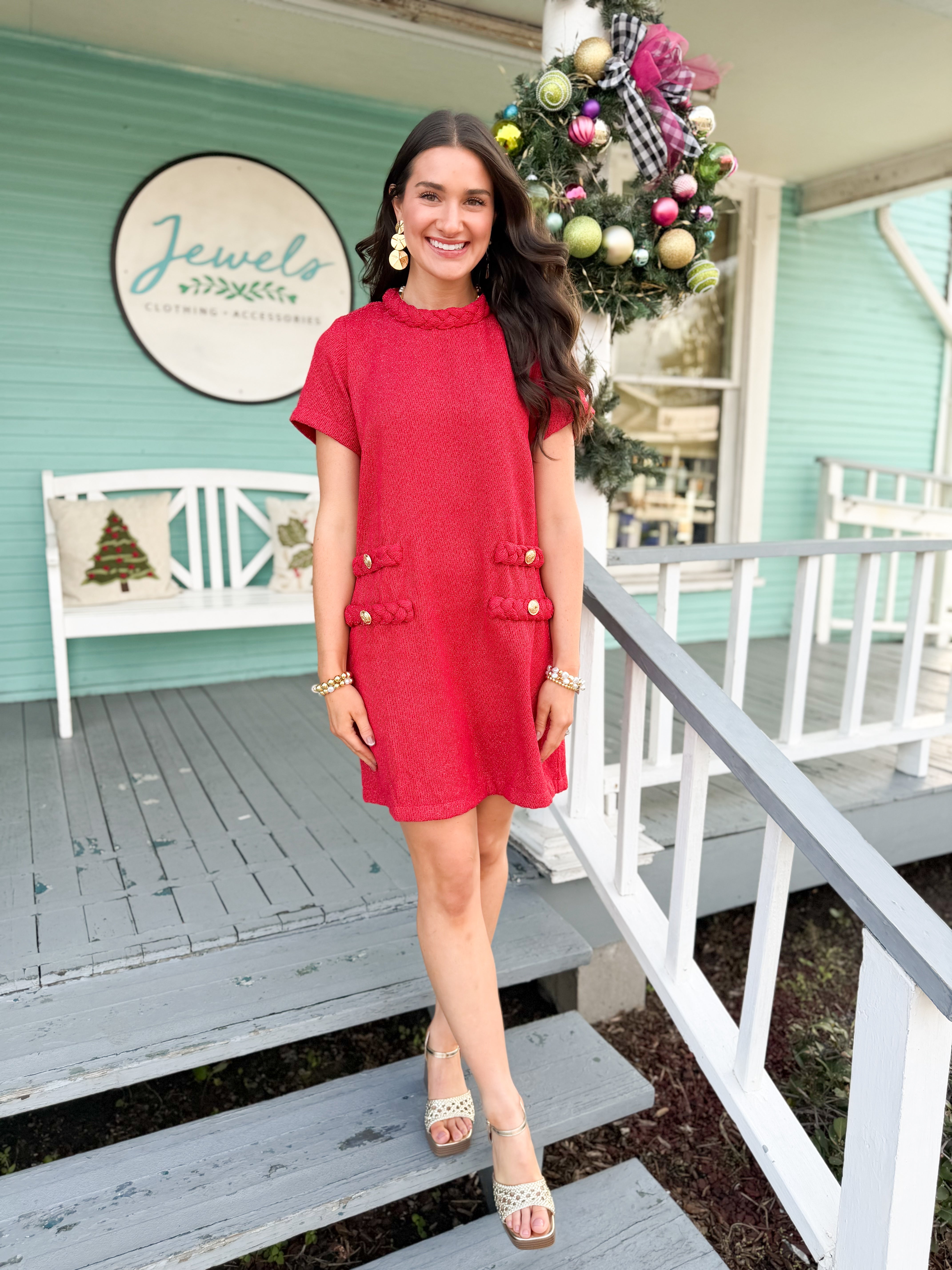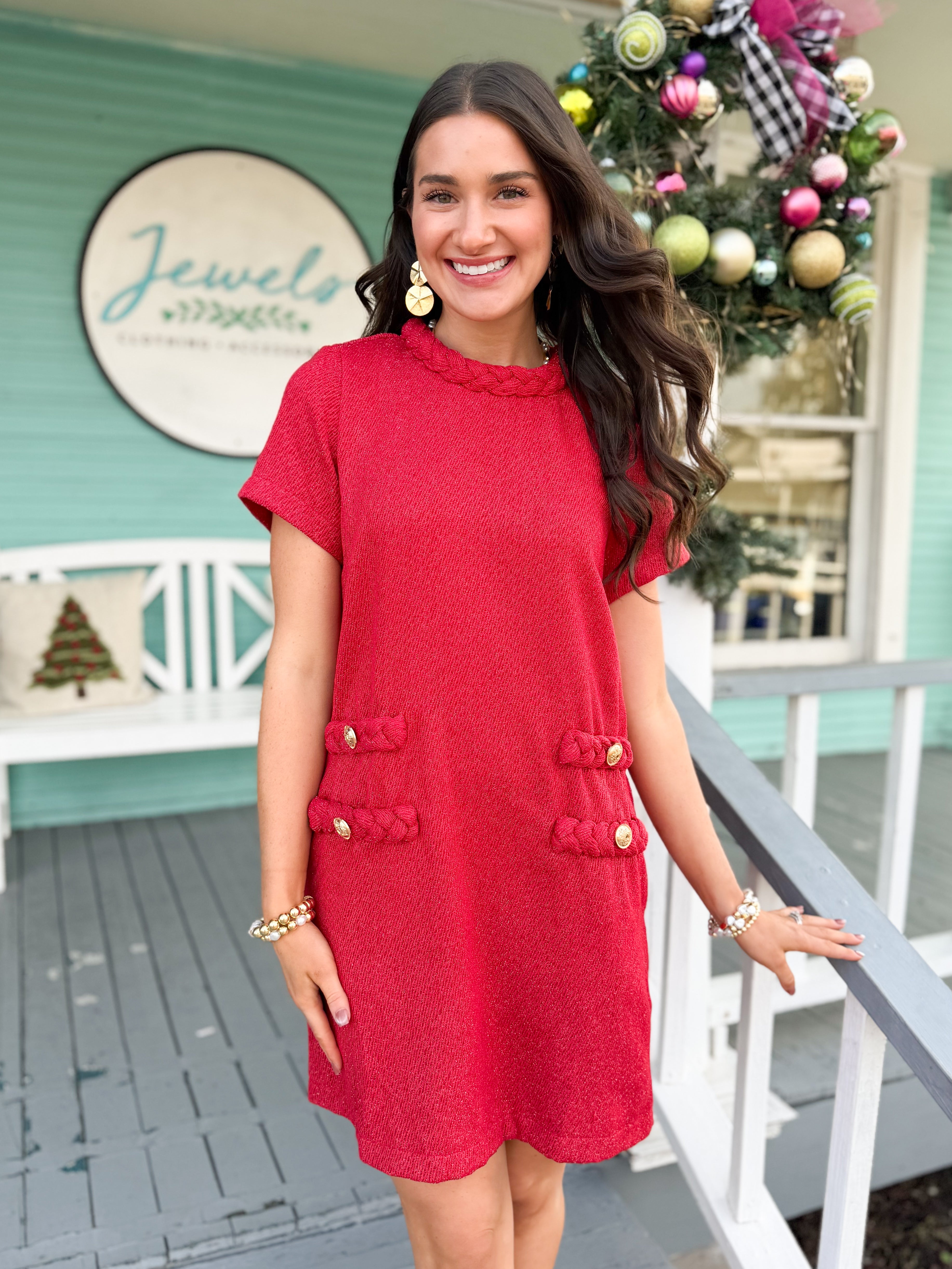 Simply gorgeous! The Matilda Dress is a red glimmery dress featuring a braided collar and pocket detail, accented with chic gold buttons on the pocket for an extra touch of sparkle.