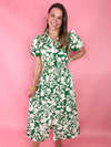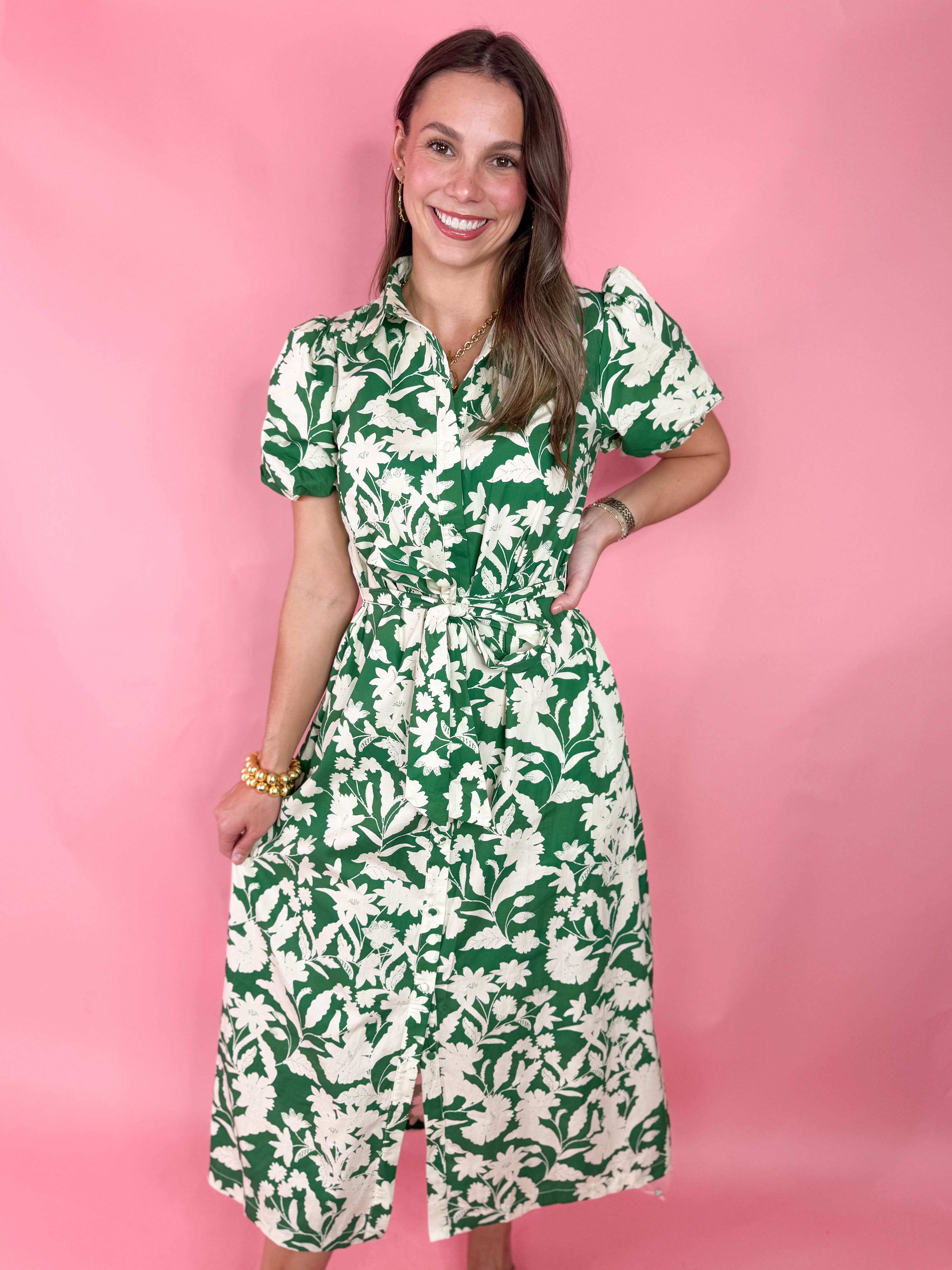 Bloom in style with this green and white floral button-down dress! Featuring a tie waist, short sleeves, and a midi-length fit, it’s effortlessly feminine, comfy, and perfect for sunny days or casual outings.