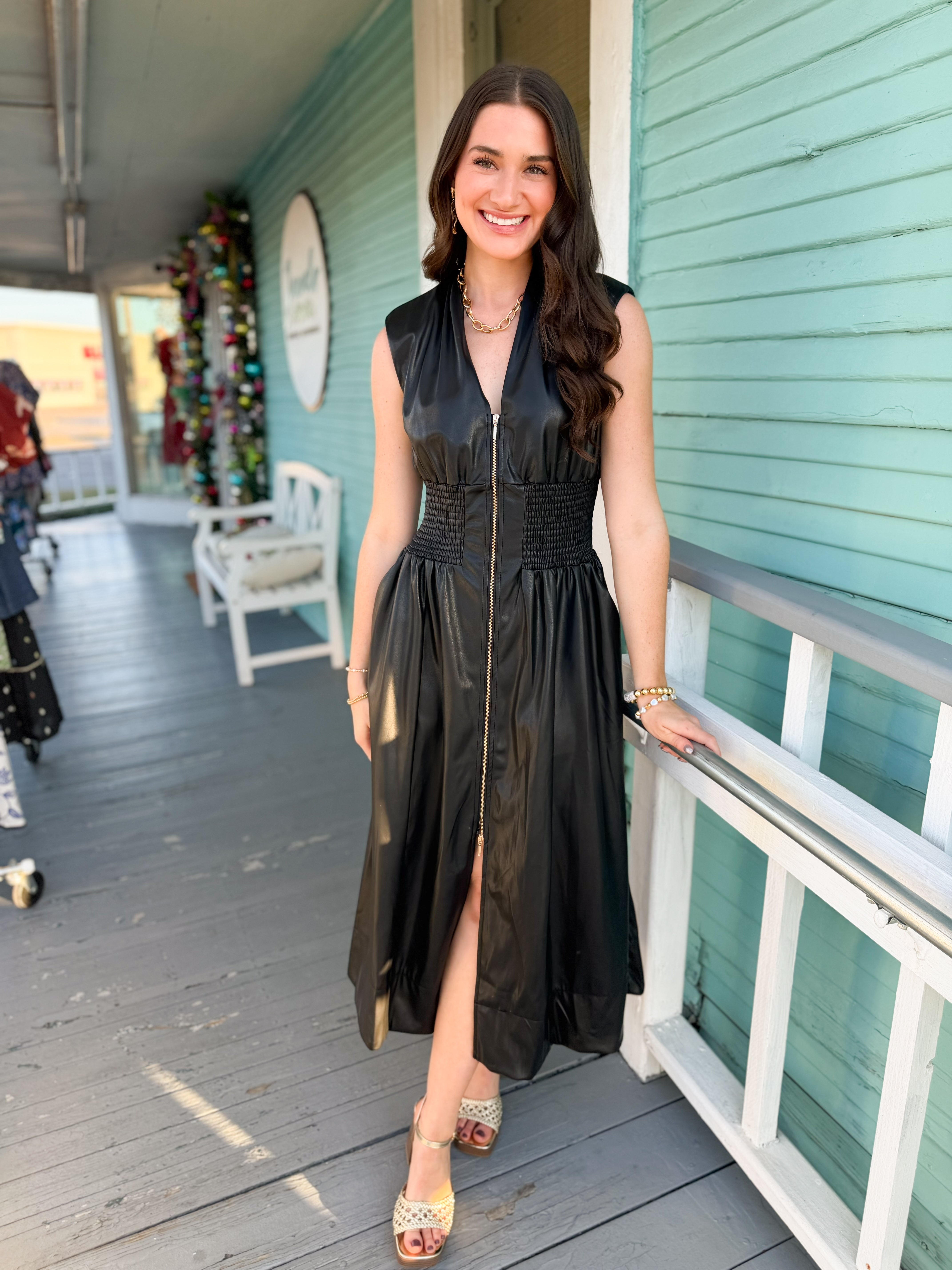 Edgy meets effortlessly feminine in The Ray Smocked Faux Leather Dress. Crafted from smooth, supple black faux leather, this standout piece combines bold texture with a flattering, comfortable fit. The smocked bodice hugs your figure, while the softly flared skirt adds movement and balance.