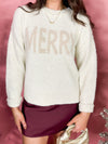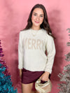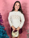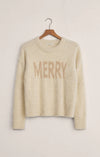Shimmering metallic yarns elevate this cozy knit with a subtle holiday glow. The "Merry" intarsia detail makes it festive yet wearable beyond the season.