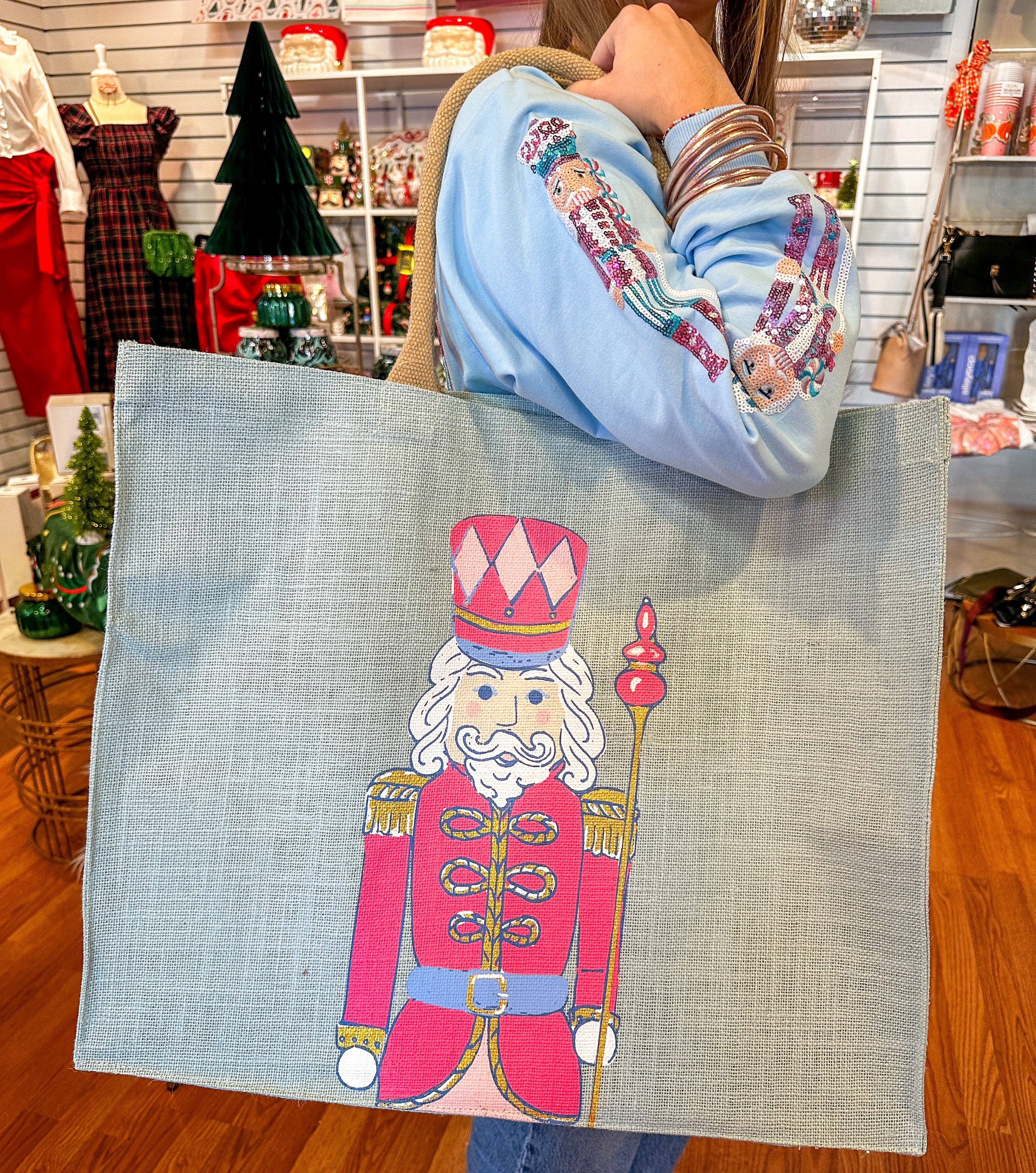 Add a festive pop of color with The Candy Nutcracker Carryall Tote in pink. Perfect for holiday shopping, travel, or gifting, this spacious and durable tote combines practicality with whimsical holiday style.