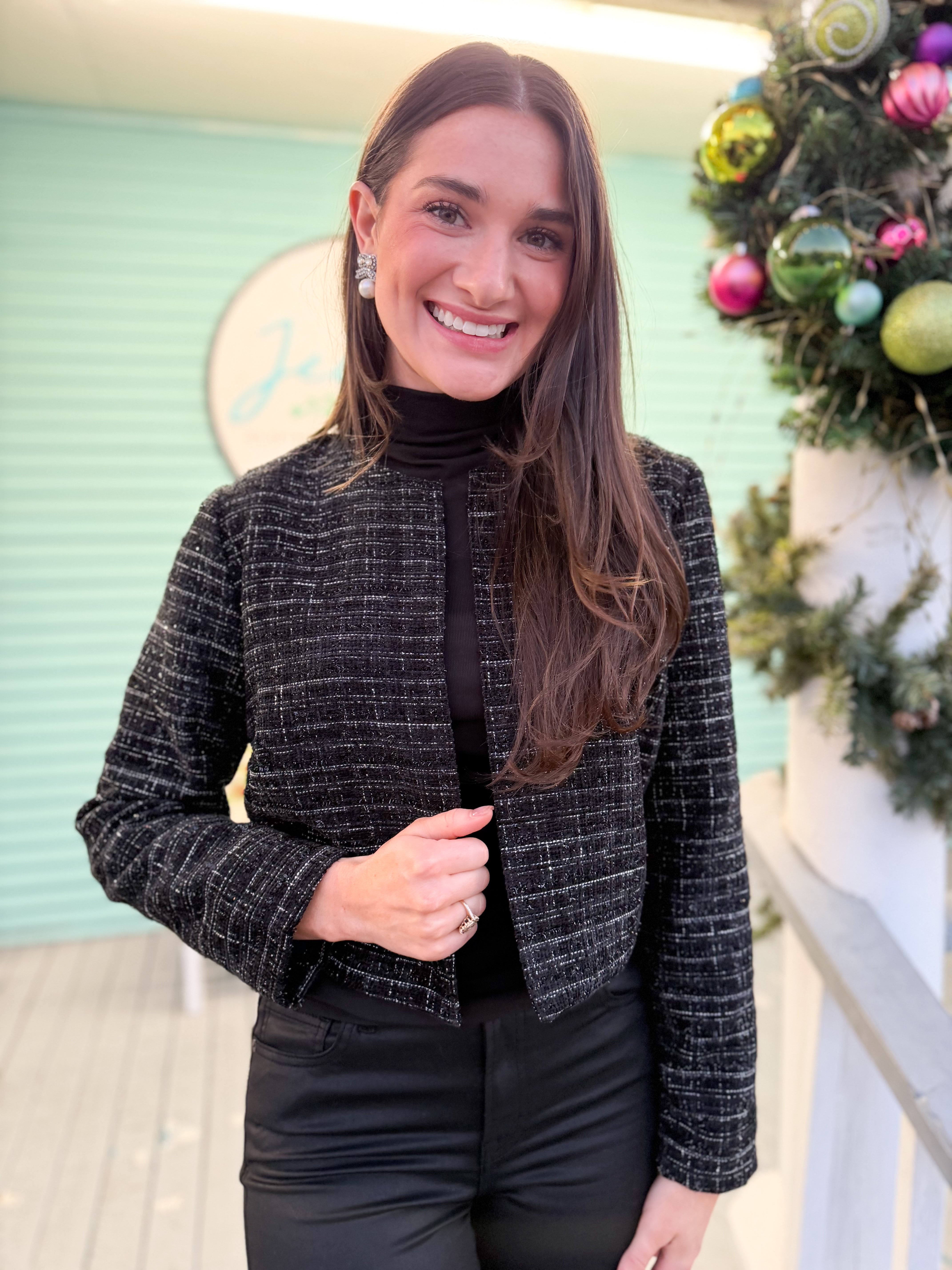 Elevate your wardrobe with this black tweed open-front crop jacket—a timeless, chic statement piece that instantly pulls any outfit together. The structured tweed texture gives it that classic, high-end look, while the cropped silhouette keeps it modern and flattering. Perfect for layering over tanks, blouses, dresses, or even graphic tees for a stylish twist.