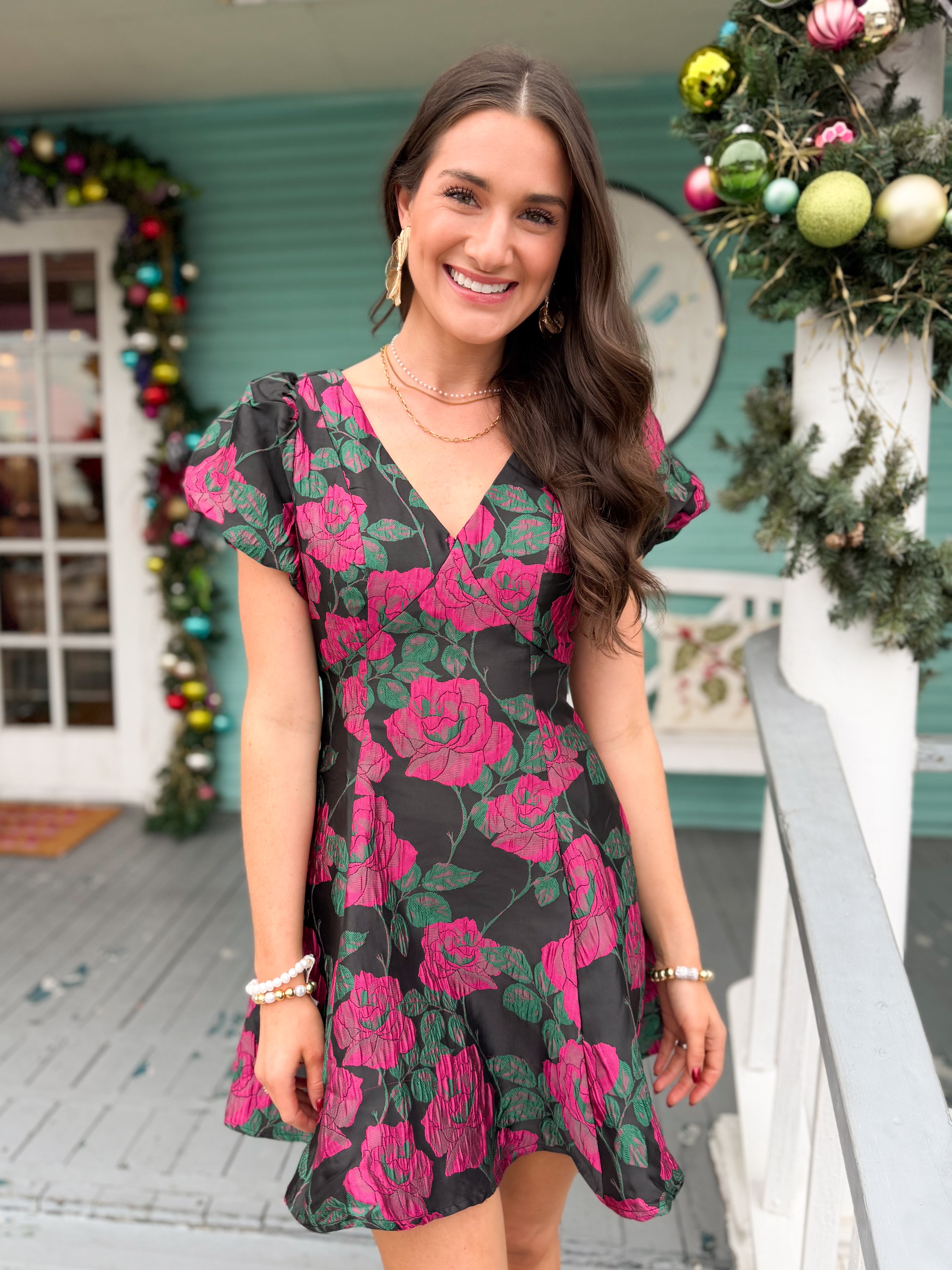 Add charm to your wardrobe with this elegant mini dress. Featuring a fit-and-flare silhouette, V-neckline, short bubble sleeves, and jacquard floral texture, itโs finished with an invisible back zipper. Perfect for brunch or date nights! Style it with block heels and a clutch.