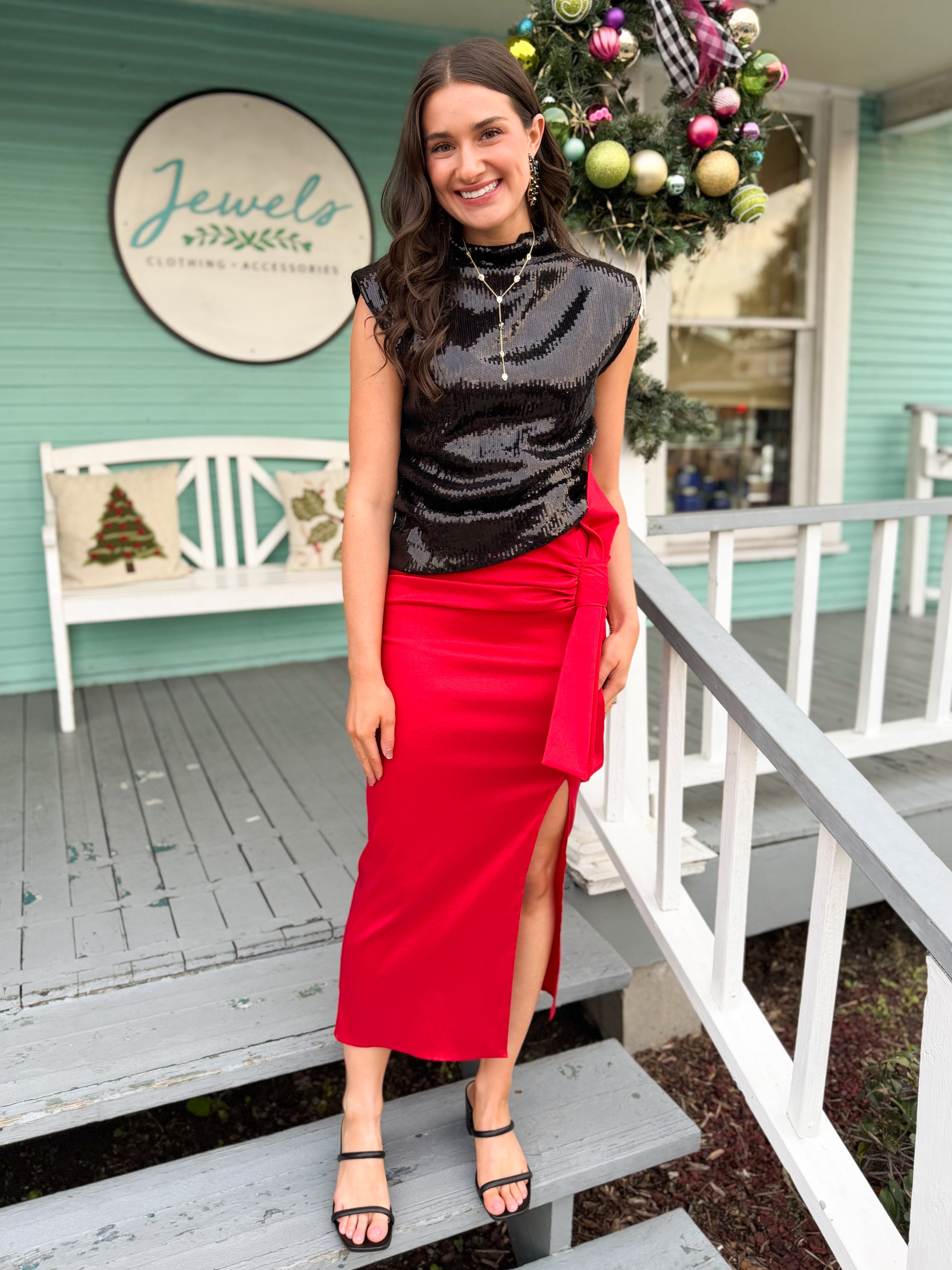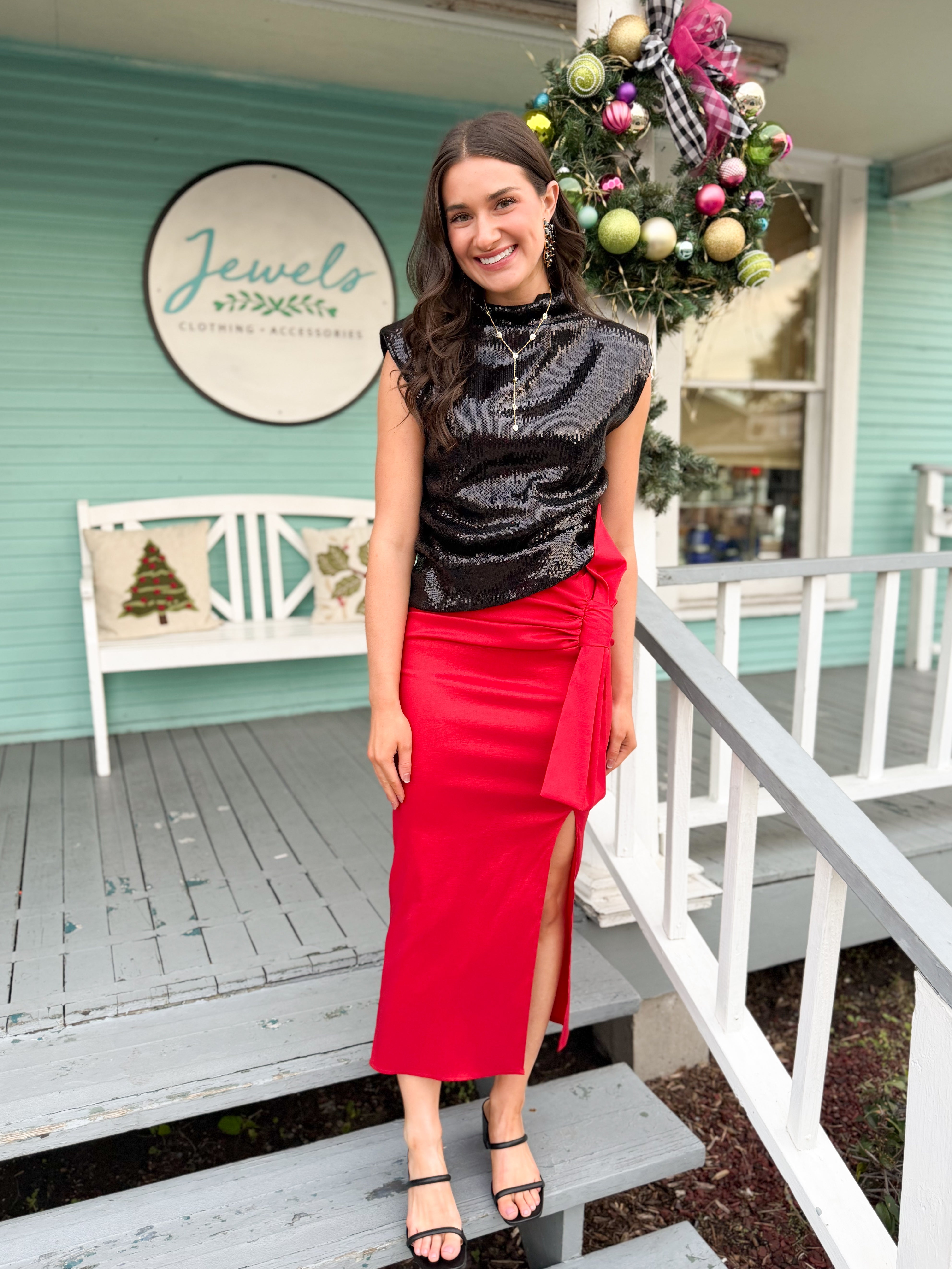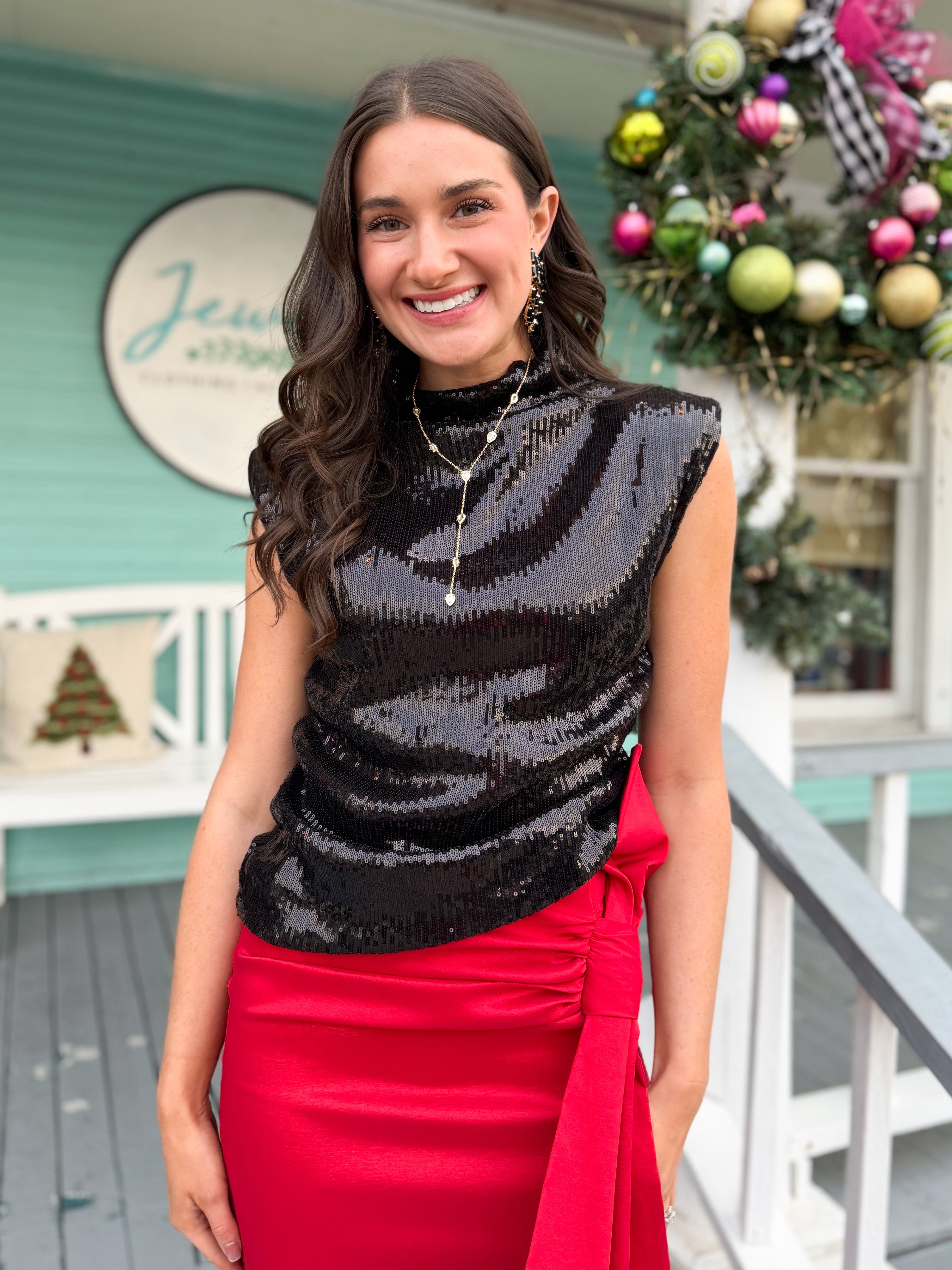 Turn heads in this black mock neck top covered in dazzling sequins. Chic, flattering, and perfect for adding instant glam to any look. Styled with the Margo Midi Bow Skirt.