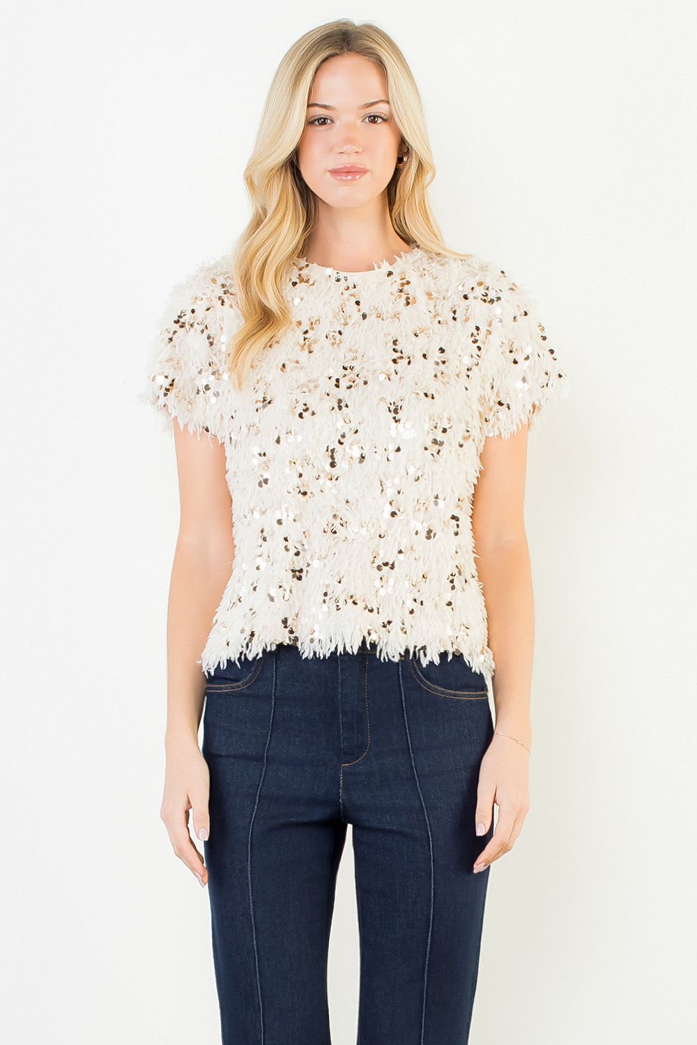 This top might be more fun than the party itself! Feathery AND sequined, our THML Sequin Eyelash Top is easy to love and just too hard to beat in your holiday line up.