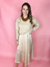 Stay cozy and stylish in this sweater-top-and-chiffon-skirt dress! Featuring a soft-texture long-sleeve sweater top with a knot accent and drop shoulders, paired with a flowy mixed-pattern chiffon skirt, it’s the perfect blend of comfort and feminine elegance.
