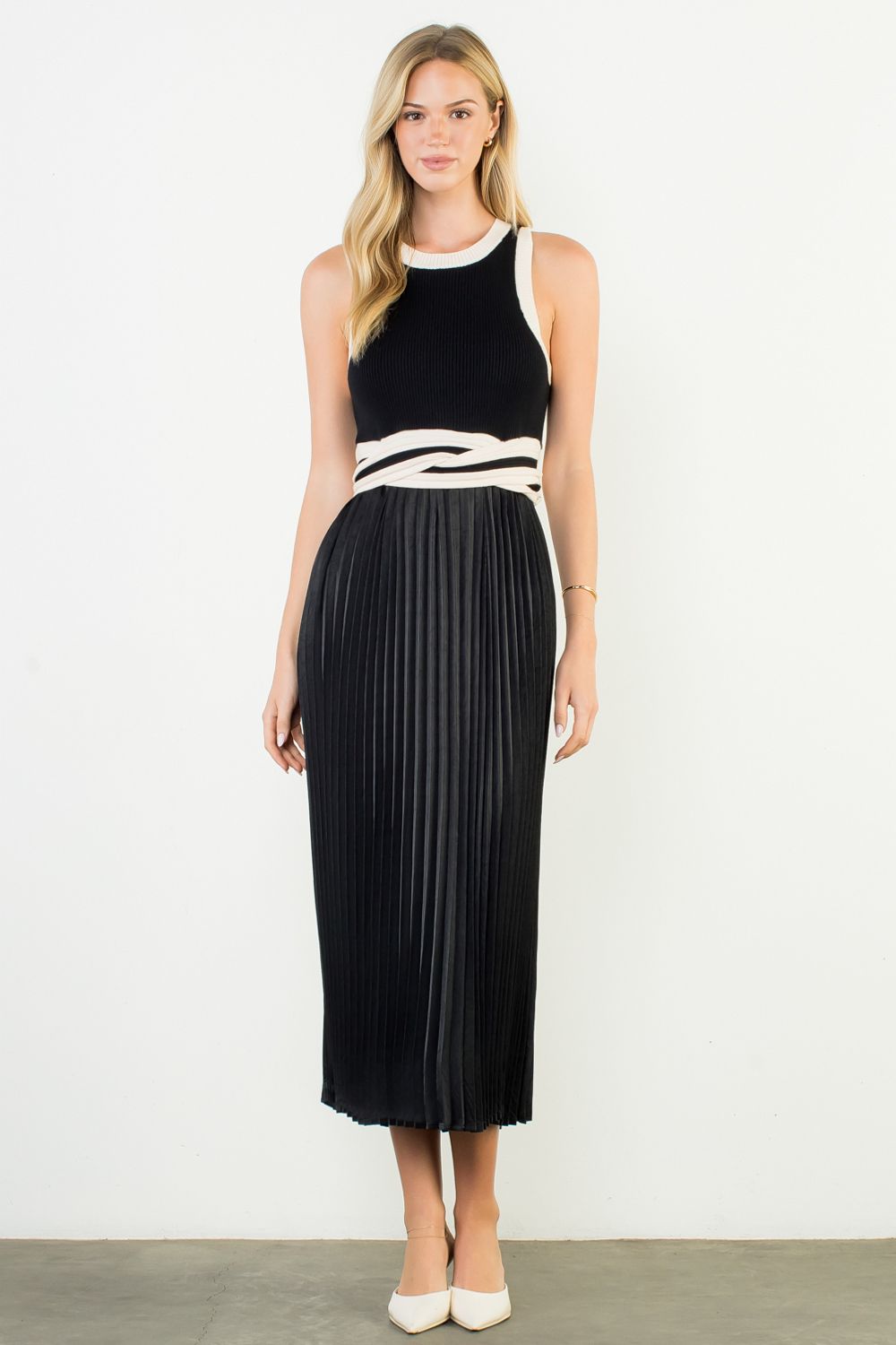 We are absolutely obsessed with the Elizabeth Sweater/Satin Midi Dress by THML. This stunning piece features a sleeveless sweater bodice, a cream-and-black contrast waistband that flatters the figure, and a beautifully pleated satin skirt that completes the look. A must-have dress for any special event on your calendar this season.