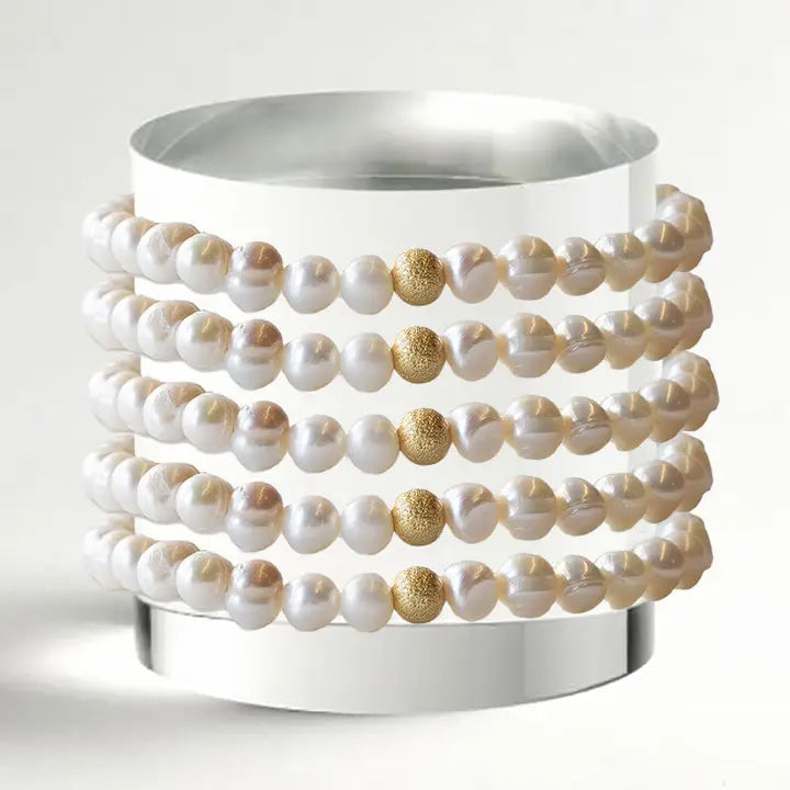 Elevate your everyday look with our 6mm Freshwater Pearl Bracelet, featuring genuine, luminous pearls with a pop of gold hand-strung for a classic and timeless style. Perfect for stacking or wearing solo, this bracelet adds a soft, elegant glow to any outfit.