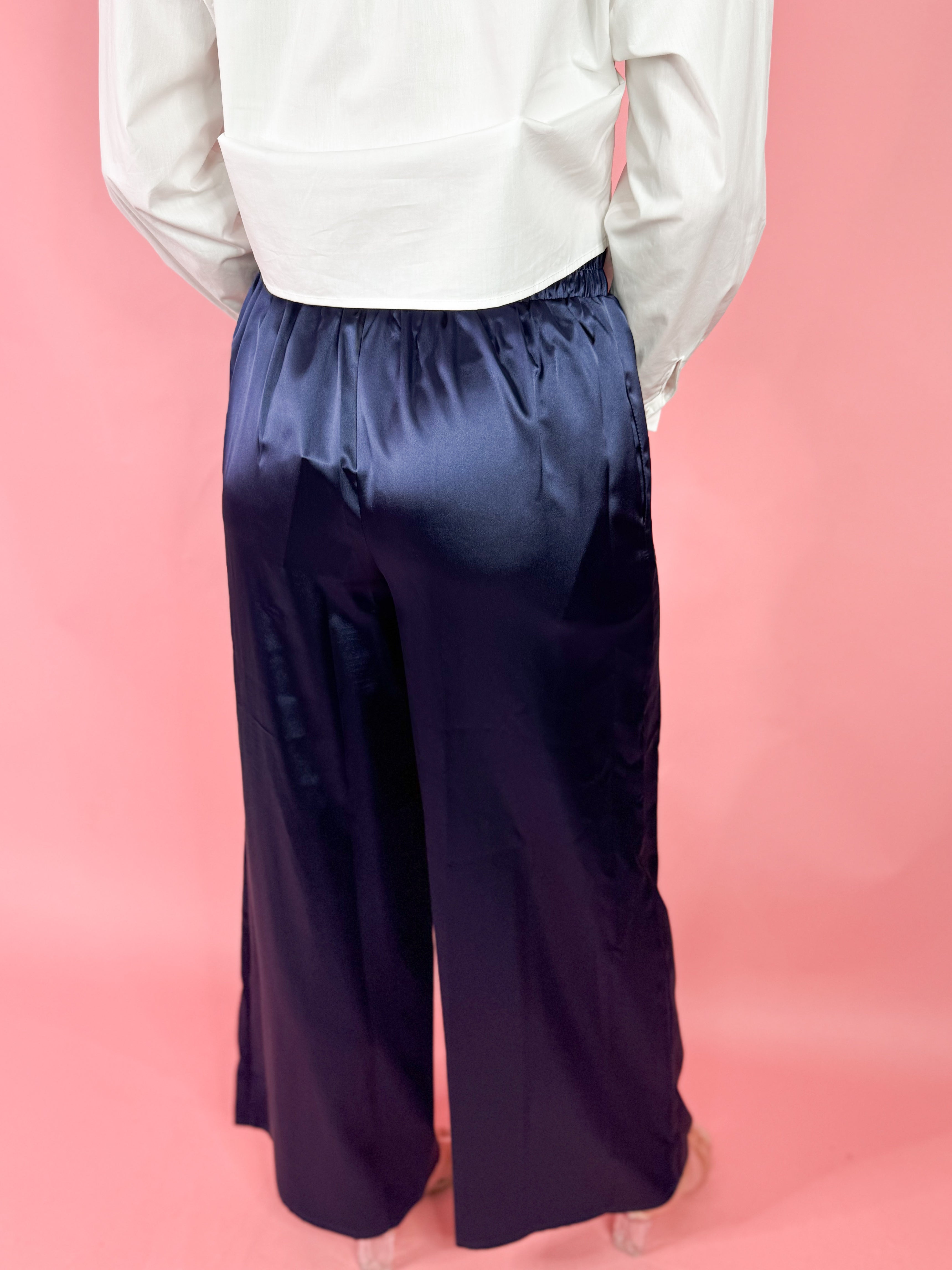 These flowy silk navy pants are effortlessly chic! They feature handy pockets, a soft lining for comfort, and a smocked back for that perfect, flattering fit. Easy to dress up or down — your new go-to for polished, comfy style!