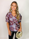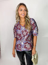 Metallic floral jacquard top with a modern boxy cut, short pleated sleeves, and subtle side slits. A standout piece with effortless shine and structure. Perfect for the sparkly season!