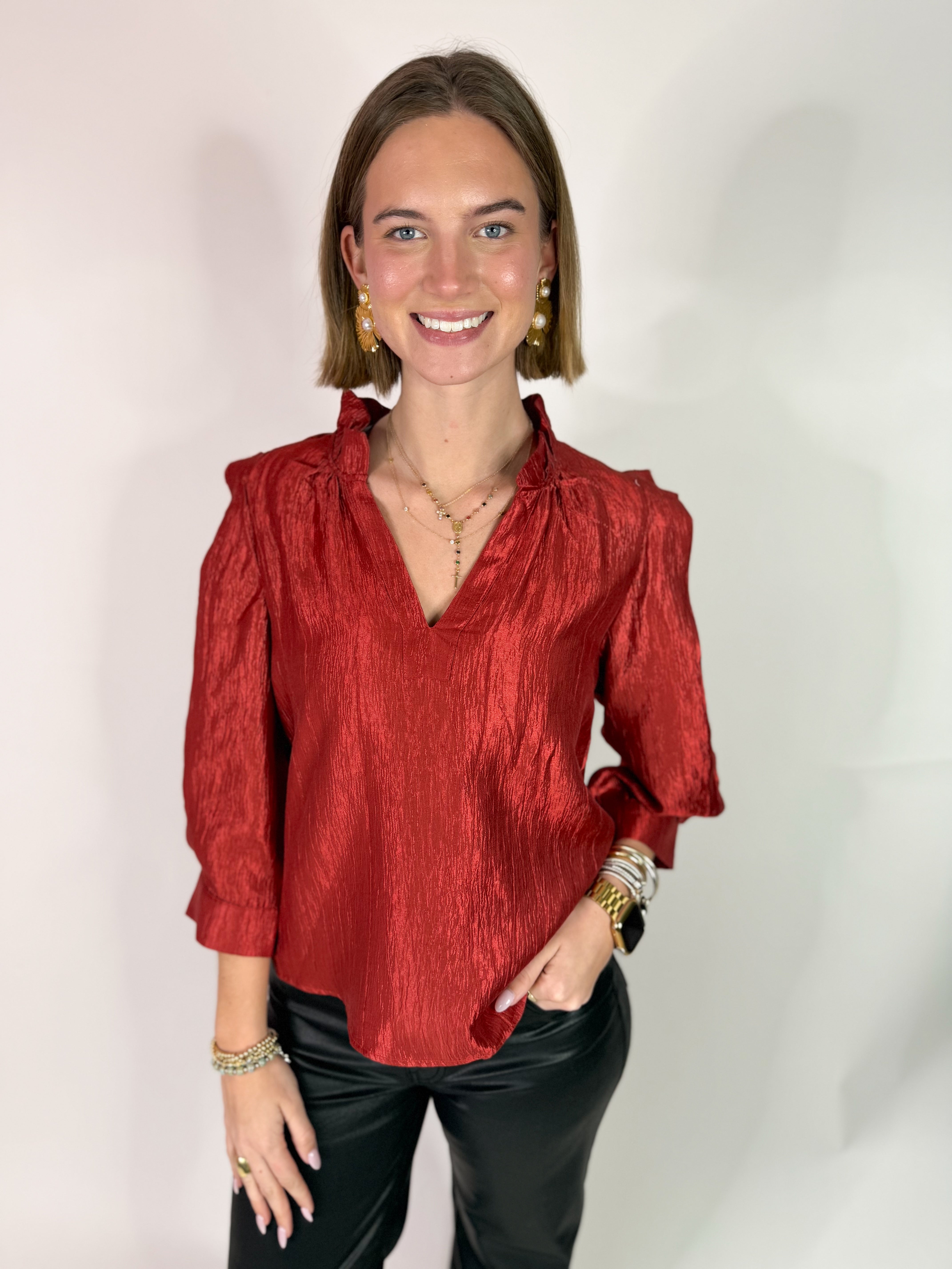 This Red Shimmer Ruffle-Neck Top adds the perfect touch of sparkle to your wardrobe. Designed with a flattering ruffled neckline and a subtle shimmer finish, it’s ideal for holiday gatherings, nights out, and special occasions.