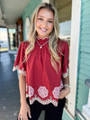 Feminine and effortlessly chic, our Bailey Embroidered Top is the perfect blend of soft structure and delicate detail. Featuring floral embroidery on the hem, this lightweight woven top stands out with a scalloped hem and flutter sleeves for a romantic touch. The ruffled high neckline and back button closure add an elegant finish to this elevated everyday piece. Unlined and non-sheer, it's easy to style and made for all-day comfort.