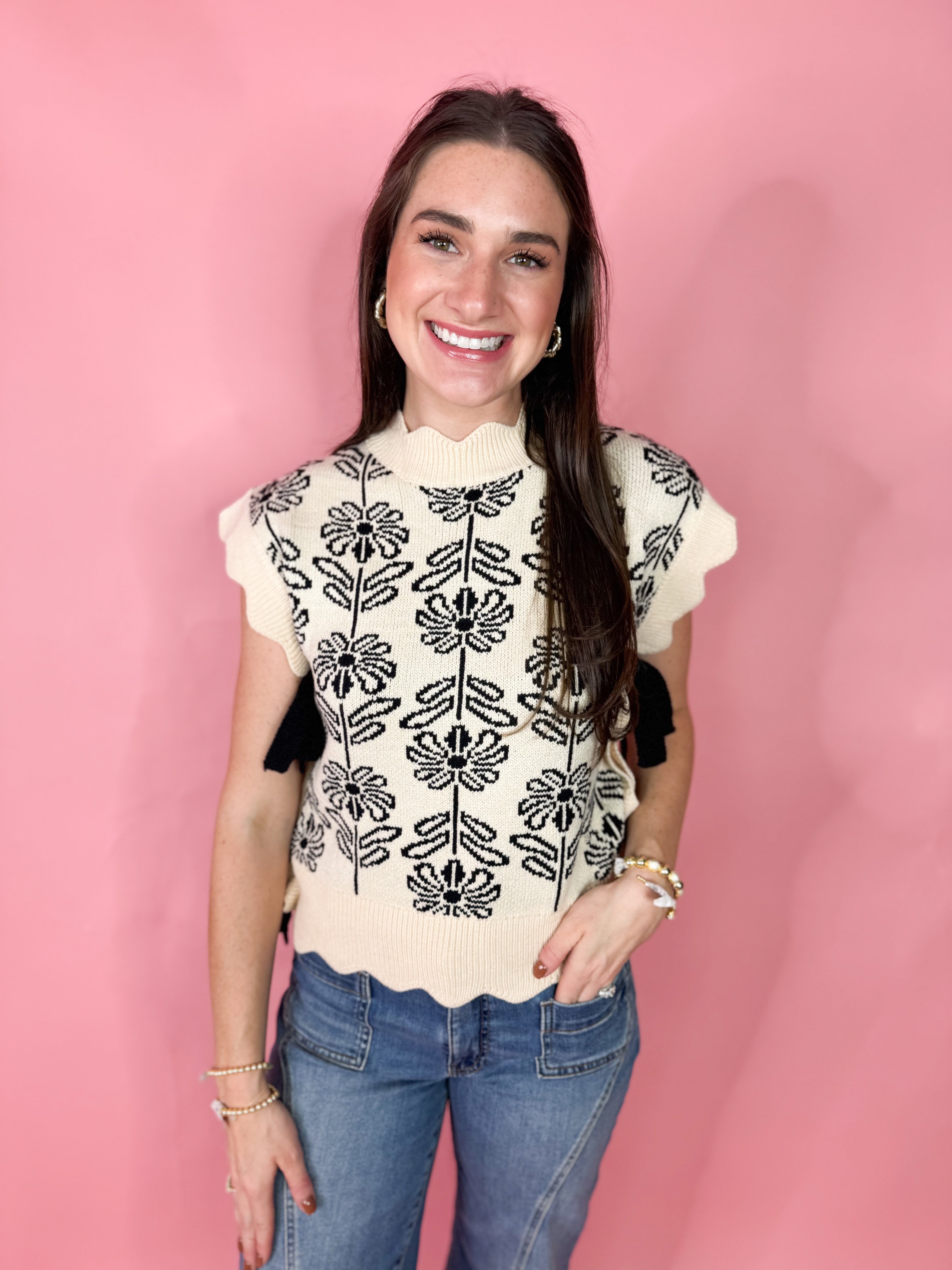 Add a touch of charm to your wardrobe with this cozy floral sweater vest. Designed with a ribbed, scalloped mock neck and hem, it features a delicate floral knit pattern for a feminine twist. Contrast side ties add an adjustable fit and a playful finish — perfect for layering over your favorite blouses or turtlenecks.