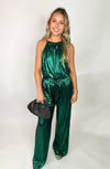 Step into the spotlight with The Amberly Metallic Jumpsuit in stunning Emerald—a statement piece designed to turn every entrance into a moment. Crafted from luxe metallic fabric with a fluid, light-catching sheen, this jumpsuit combines effortless sophistication with bold glamour.