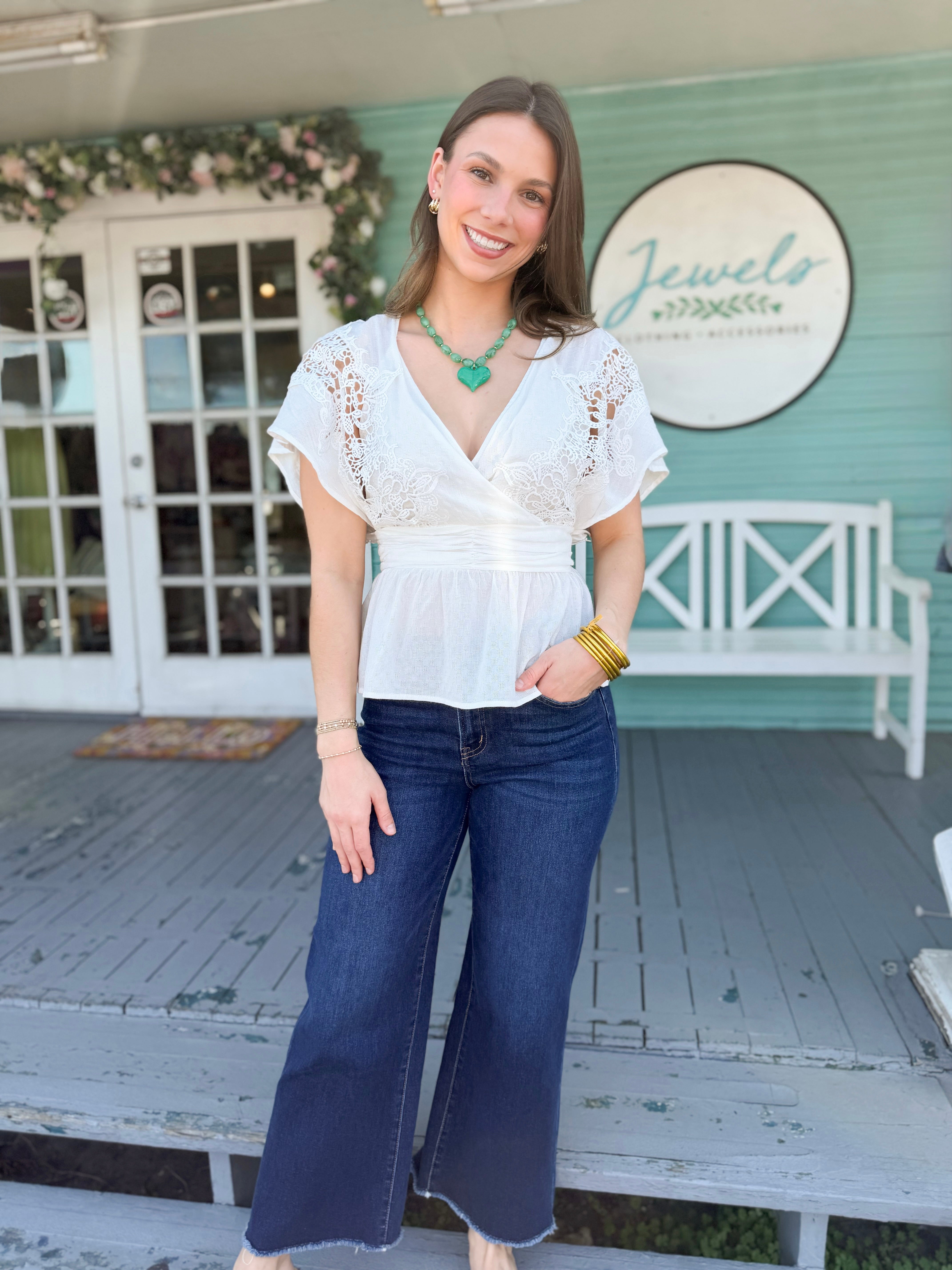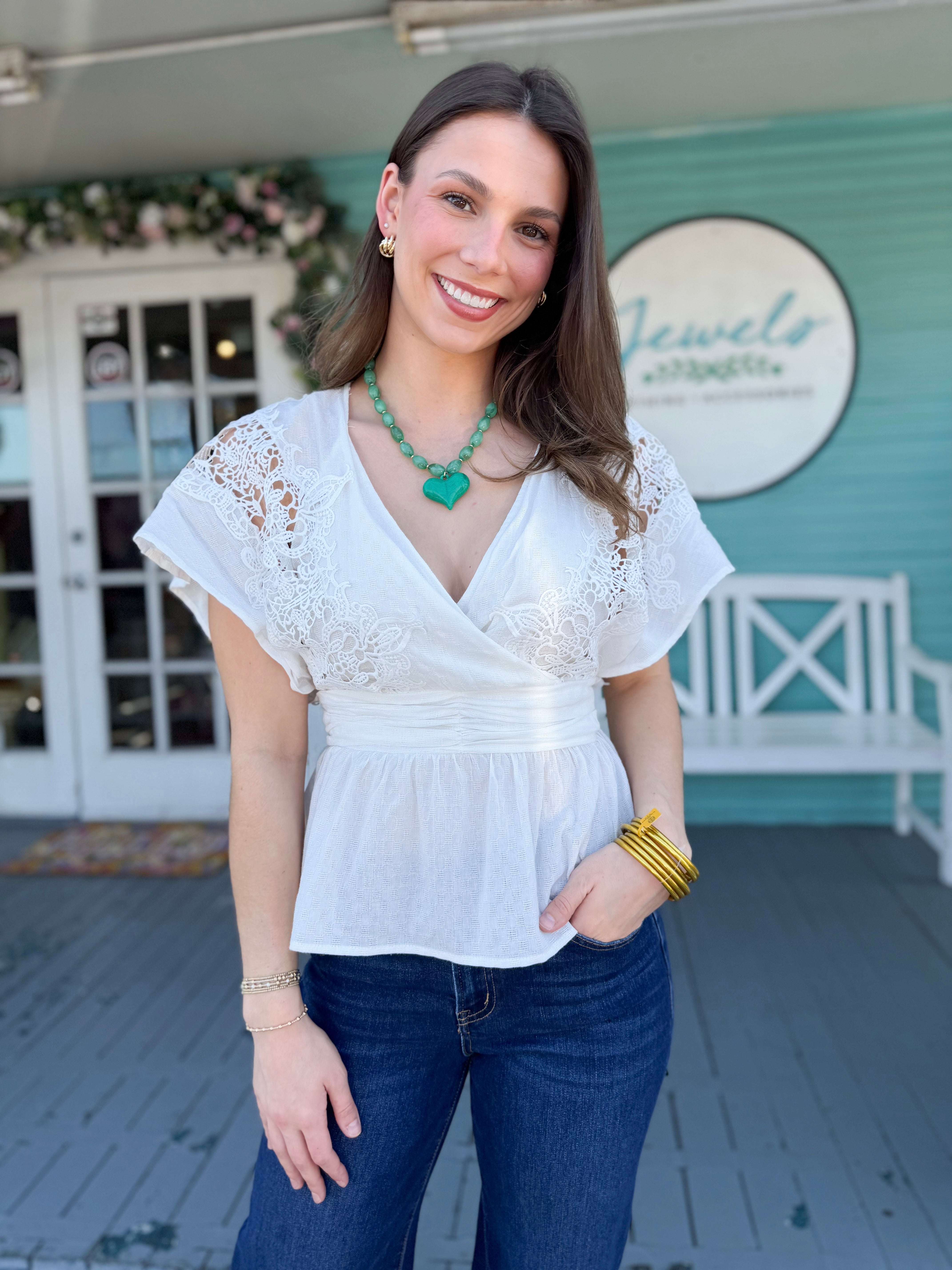 This white drapey lace V-neck top is effortlessly feminine and beautifully lightweight. The delicate lace detailing adds a romantic touch, while the relaxed drape creates a flattering, easy-to-wear silhouette. Perfect for dressing up denim or pairing with a skirt for a more elevated look.