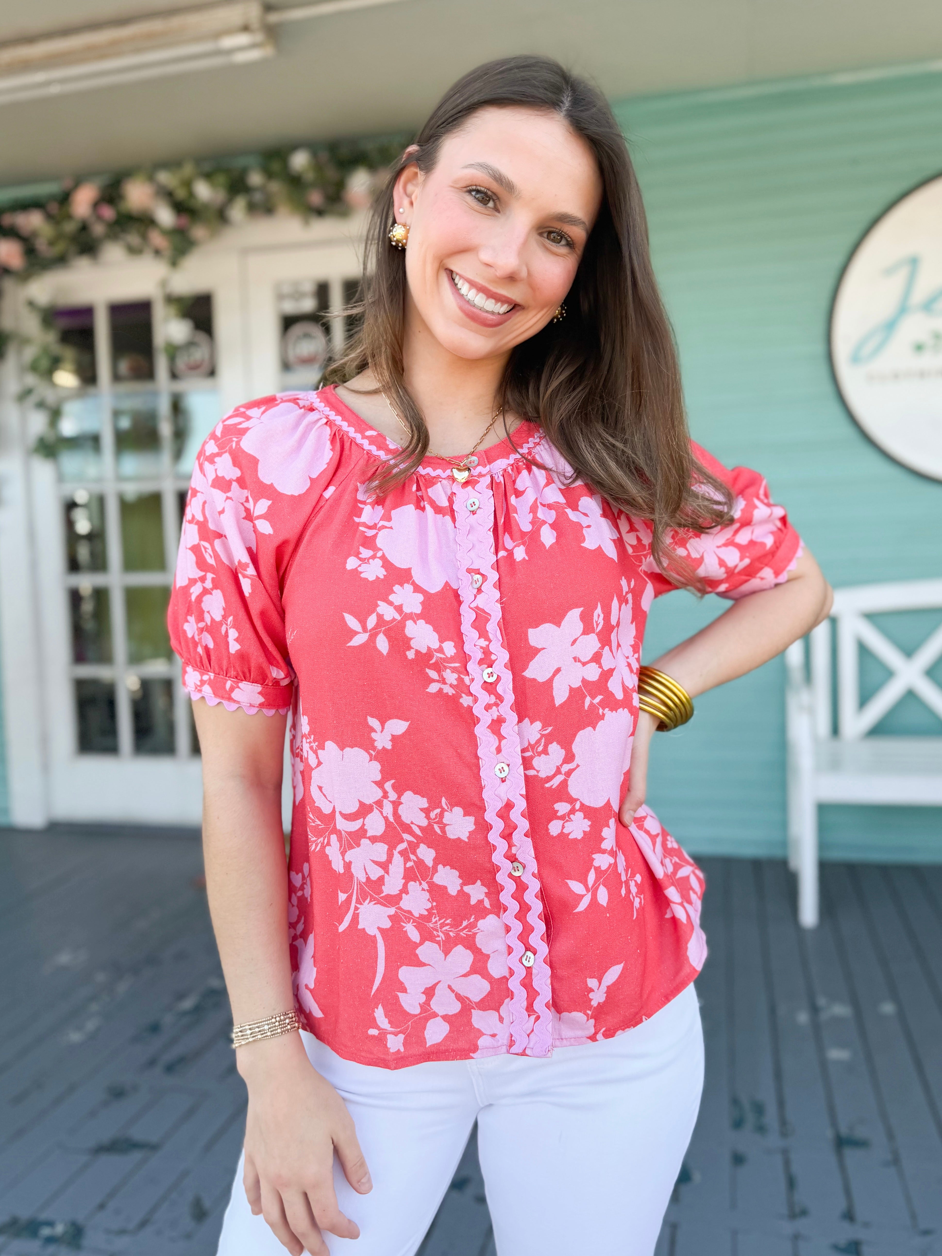 This pink and red blouse is elevated with bold ric-rac accents and a classic button-down front. The short sleeves keep it light and versatile—perfect for pairing with denim, white trousers, or a flirty skirt.