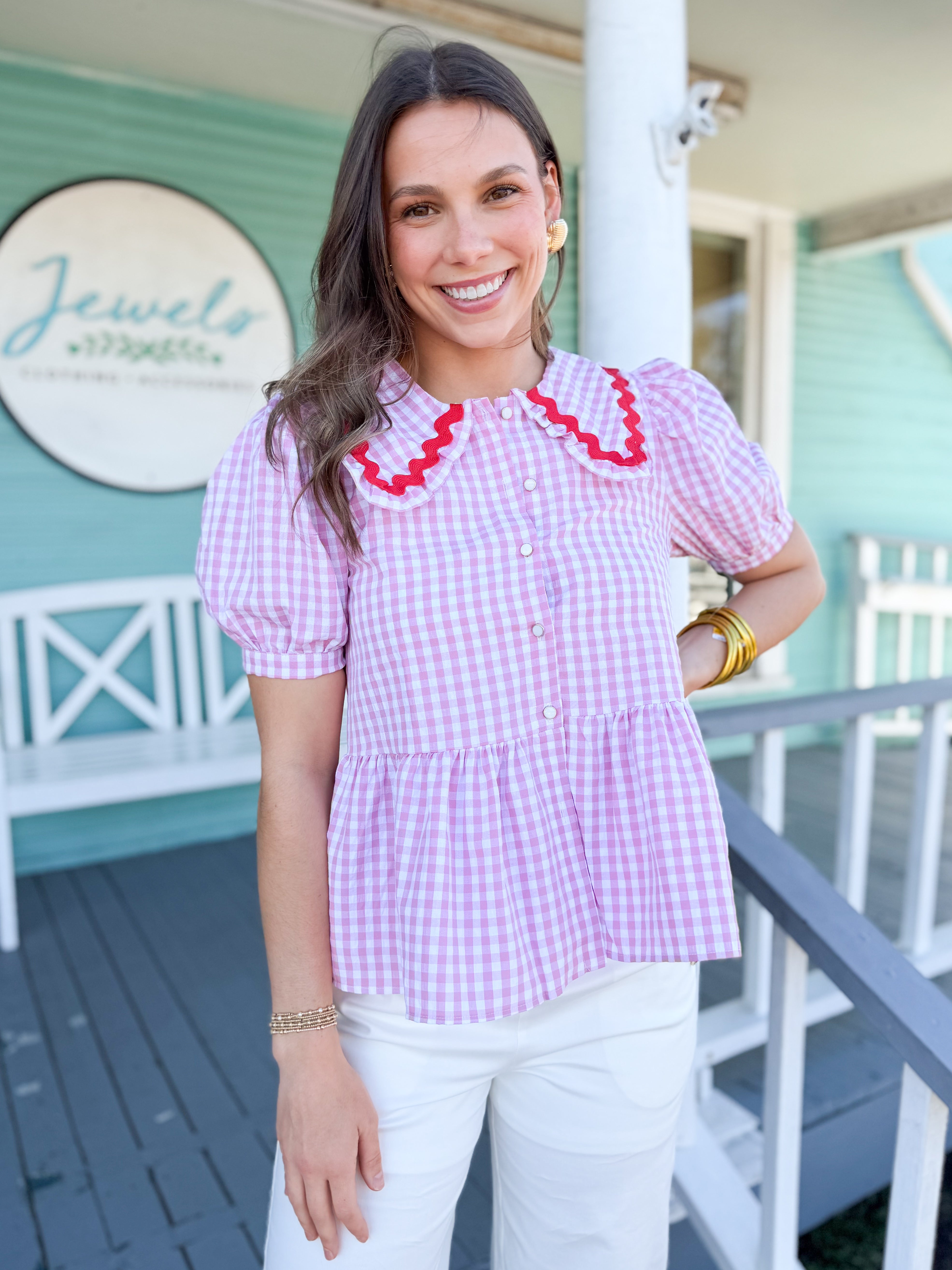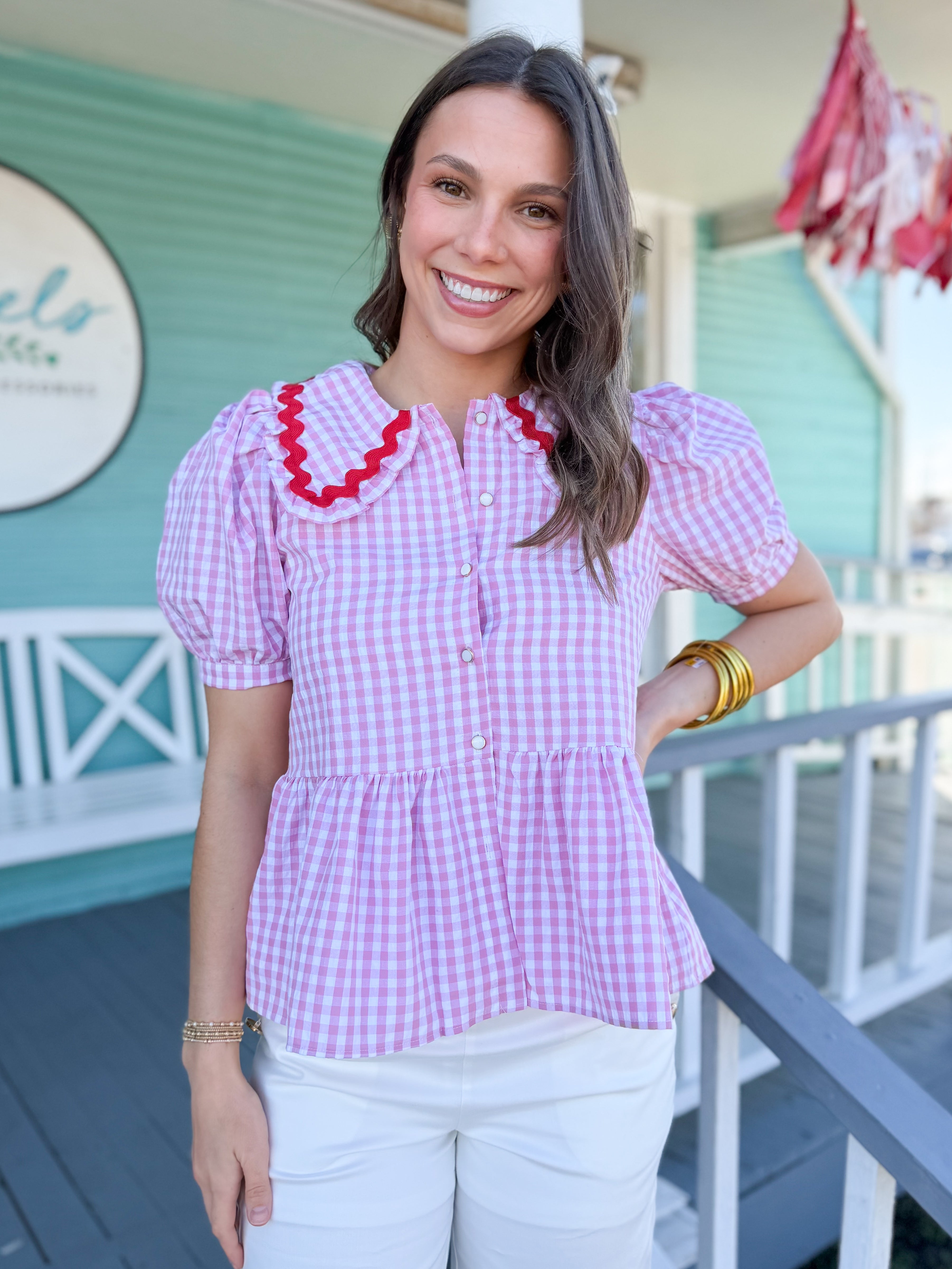 Charming pink gingham peplum button-down top featuring a sweet Peter Pan collar, delicate ricrac accent detailing, and short puff sleeves. The flattering peplum silhouette adds a feminine touch, making it perfect for pairing with denim, skirts, or tailored shorts for an effortlessly polished look.