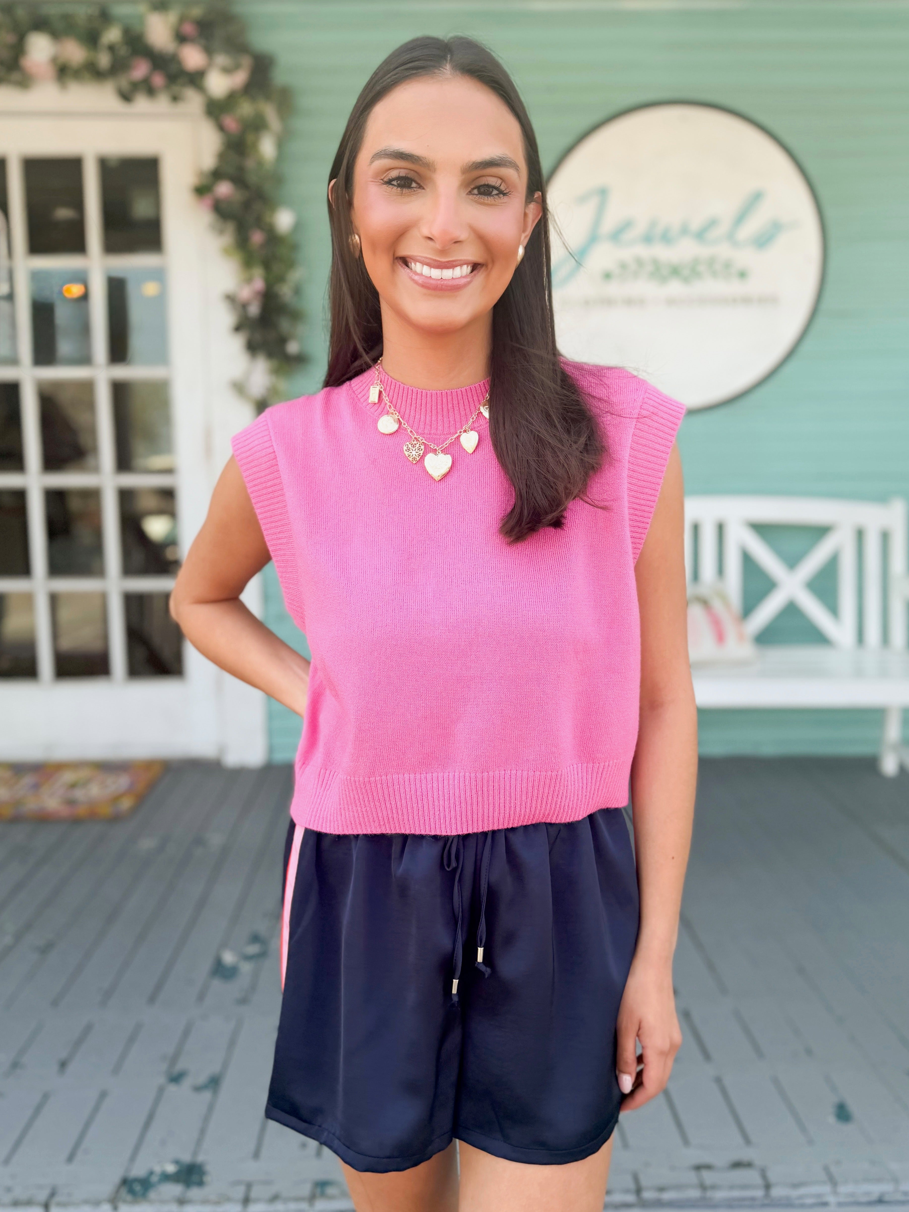 A lightweight, sleeveless knit sweater vest designed with a classic round neckline, ribbed detailing along the neckline, armholes, and hem, complete with a chic cropped silhouette. Wear it solo for a sleek, modern vibe or layer it over a t-shirt for a timeless preppy aesthetic. Pairs perfectly with everything from lounge pants and skirts to jeans and wide leg trousers.