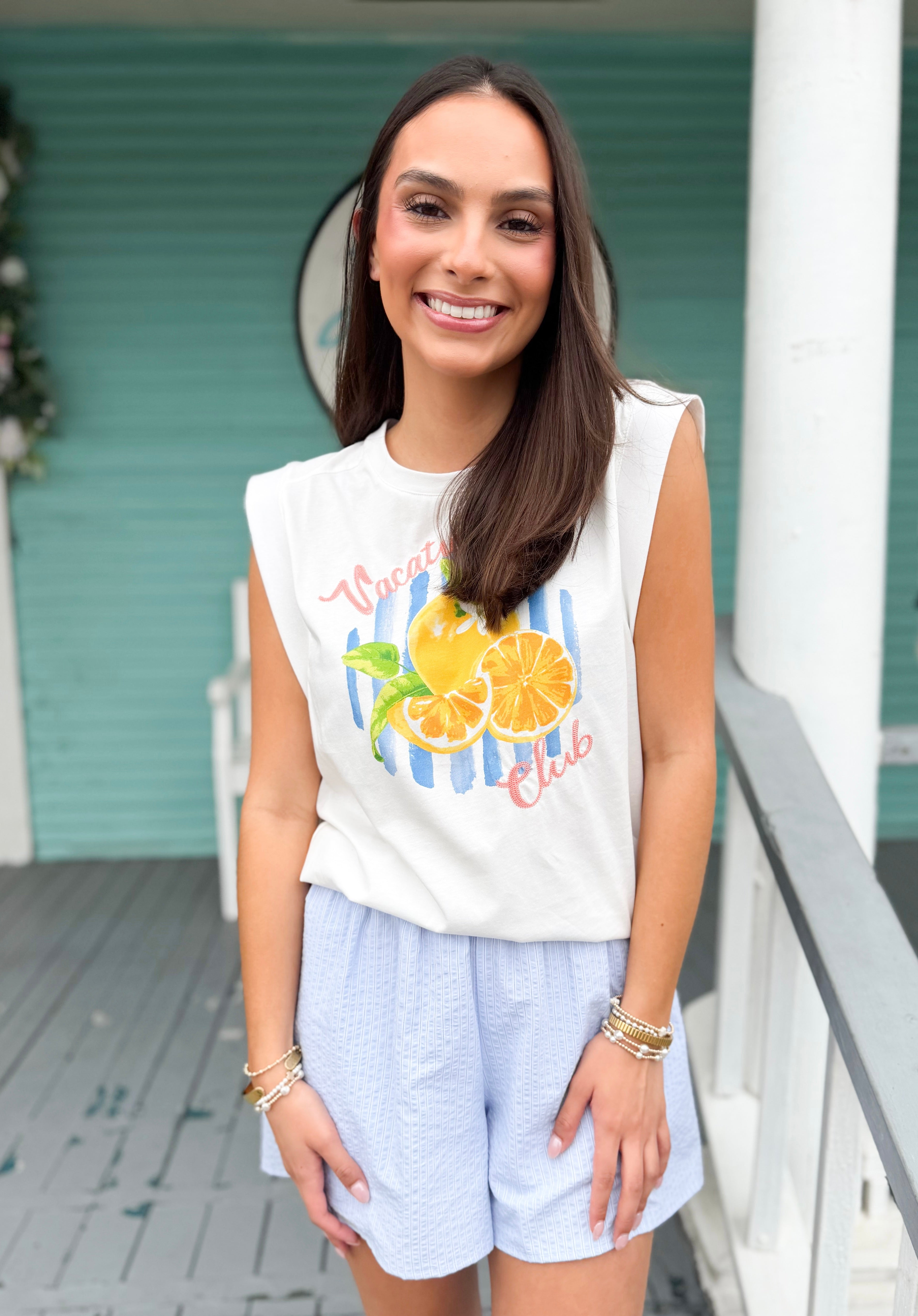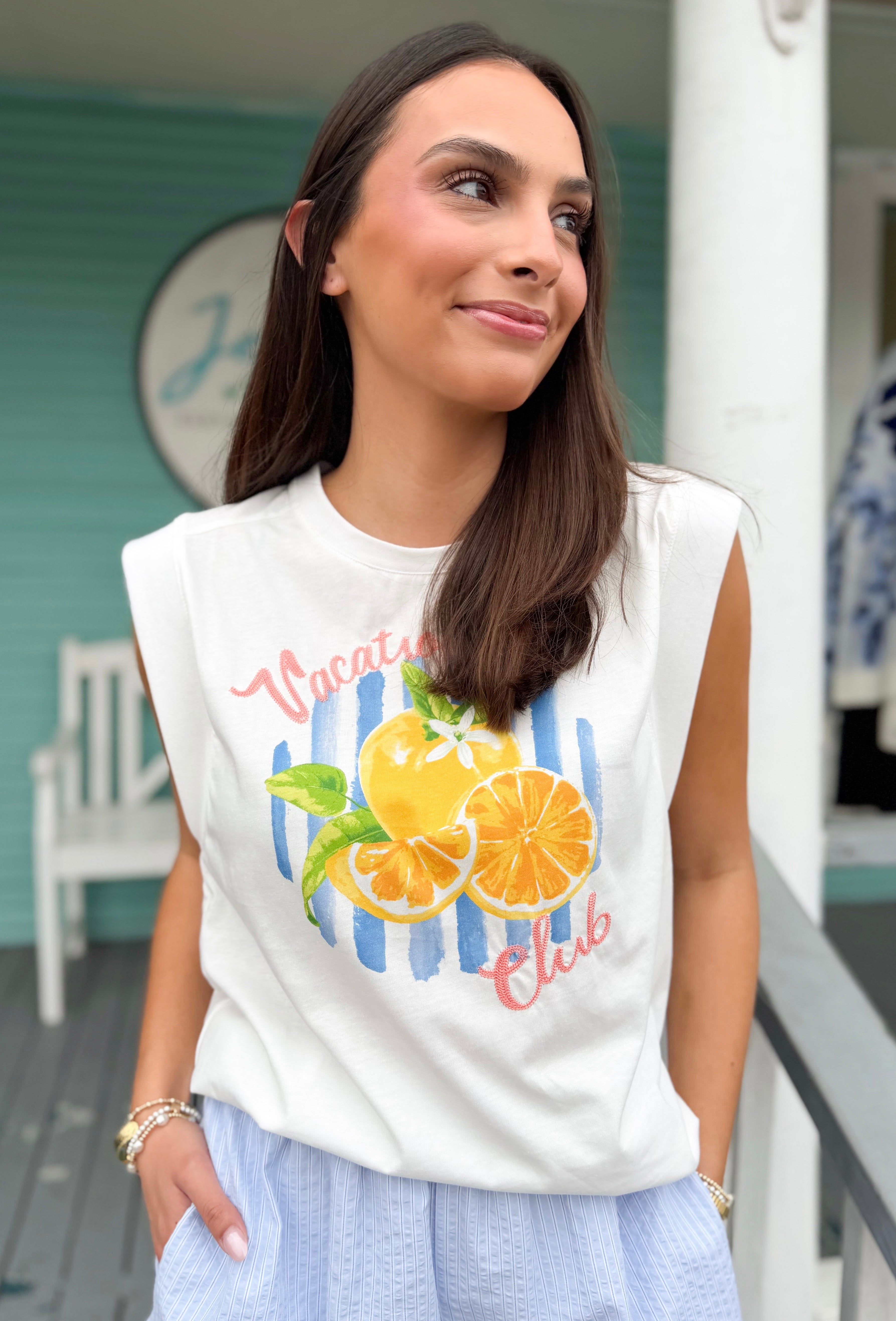 Say hello to your new getaway favorite top! This Graphic Vacation Club embroidered top is bursting with charm, featuring playful orange print that gives it the perfect pop of sunshine. The fun graphic design brings those laid-back, on-holiday vibes, while the soft, easy fit keeps it comfy for all-day wear. Pair it with our Faye Striped Shorts, denim shorts, white jeans, or your favorite skirt for a look that feels fresh, fun, and ready for vacation mode.Â