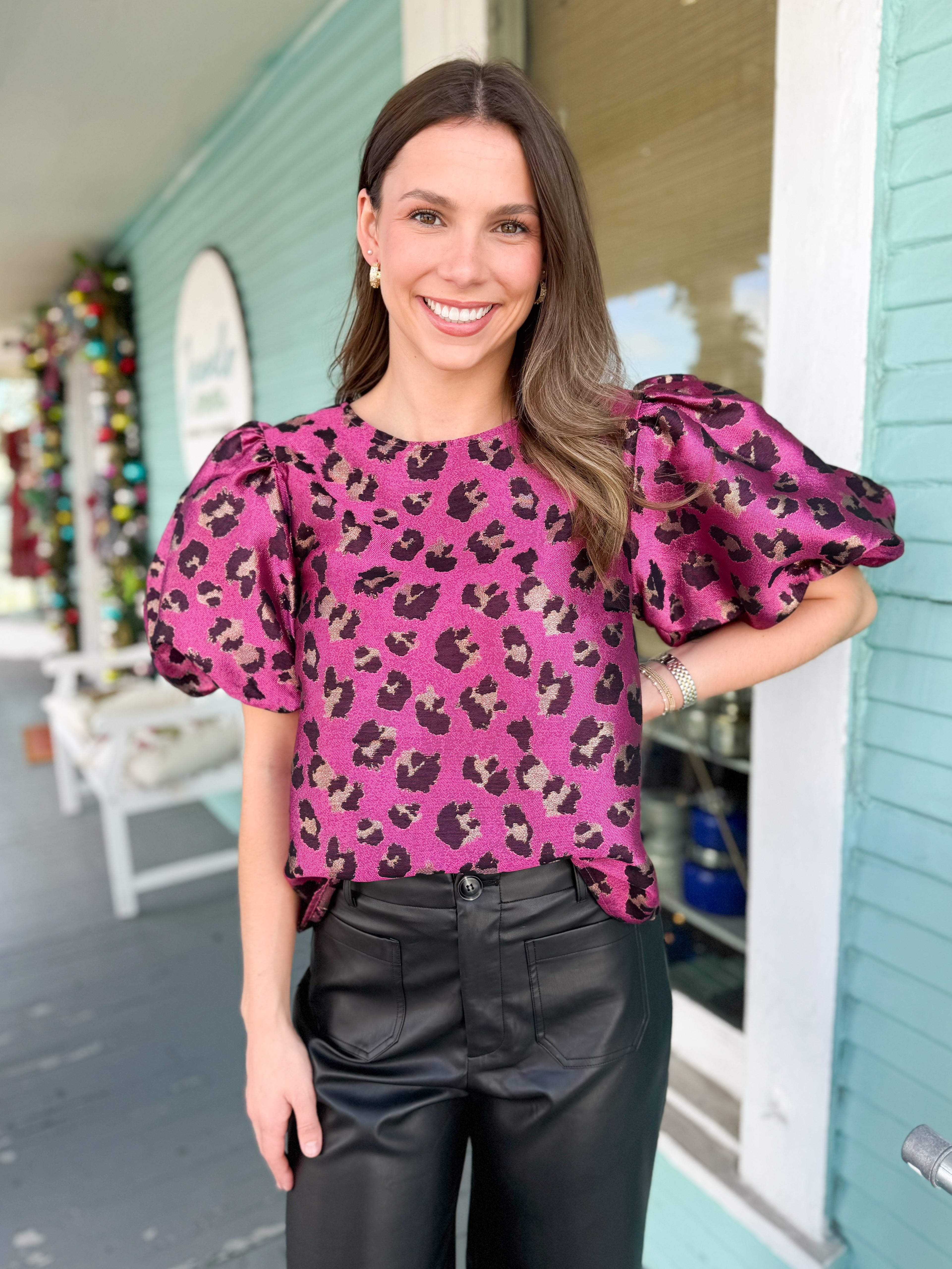Turn heads in this hot pink puff-sleeve top featuring a bold leopard print and a gorgeous subtle sheen. Fun, fierce, and perfect for adding a pop of personality to any outfit.