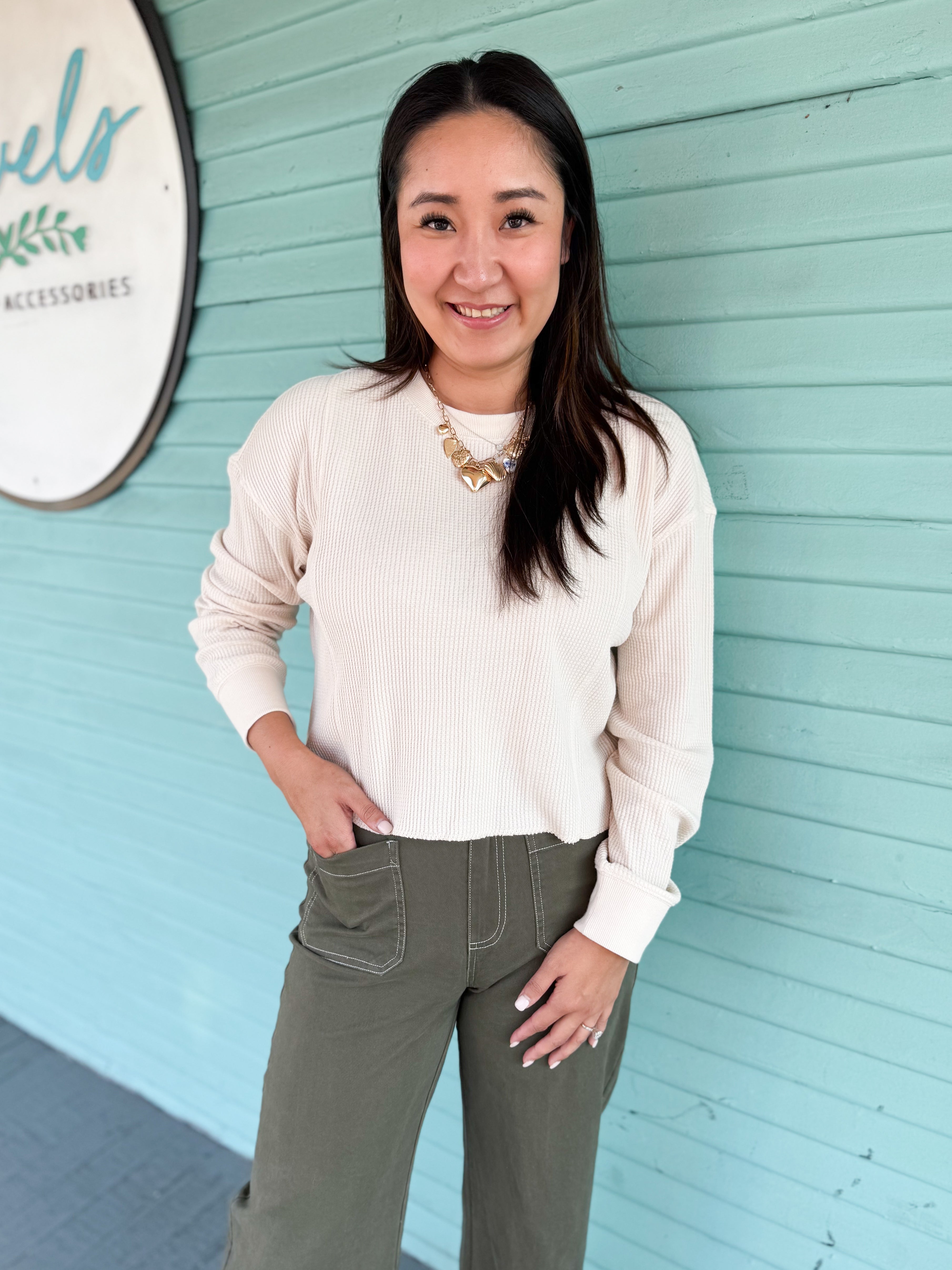 Easy, breathable, and just the right amount of relaxed. This mineral-washed, cropped thermal features soft waffle knit and subtle seaming details that elevate your everyday rotation.