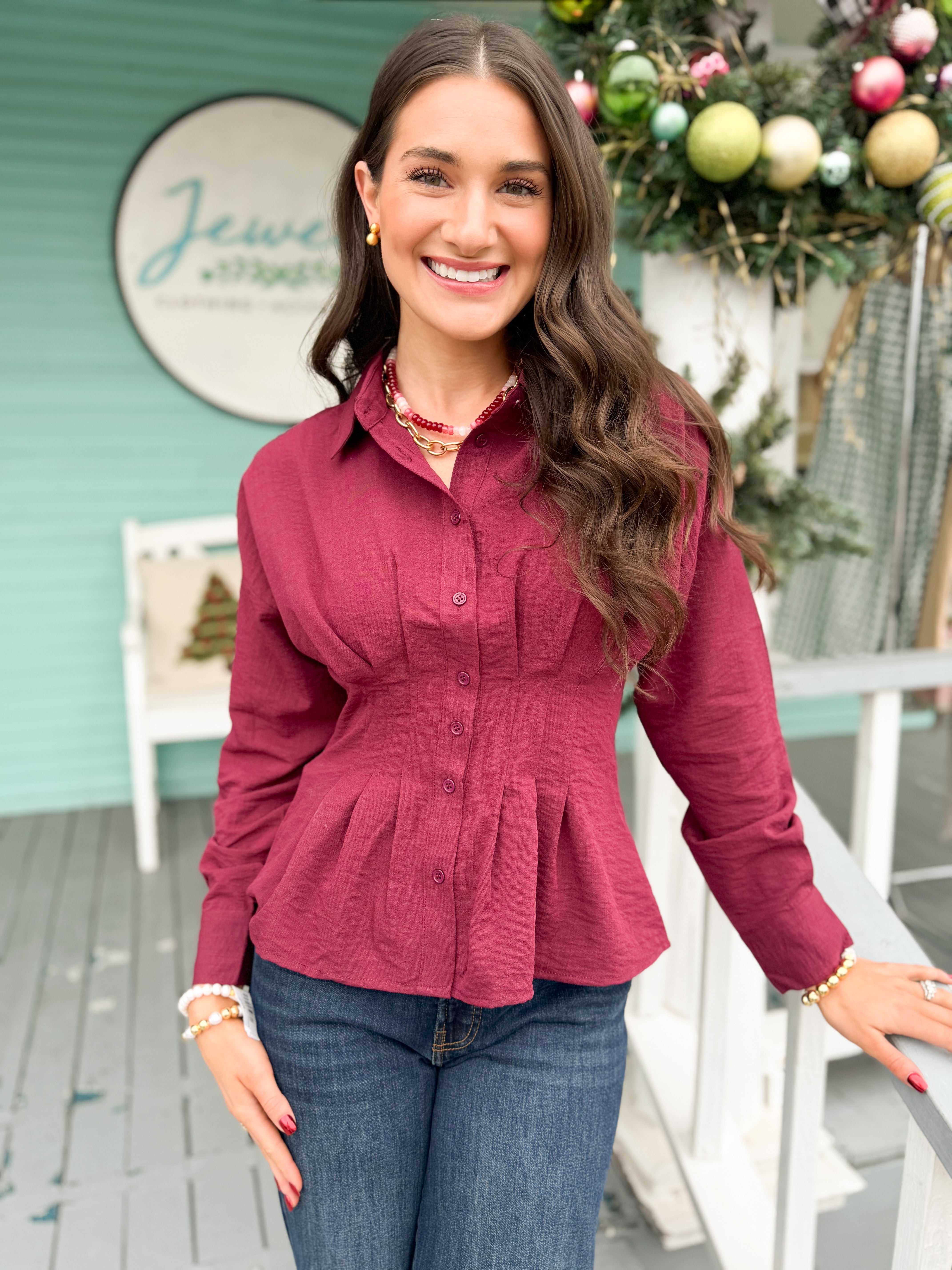 Solid long sleeve peplum top featuring pleated bodice and waist detailing. Button-down front with classic collar. Cuffed sleeves with button closure. Unlined. Non-sheer. Woven. Lightweight.