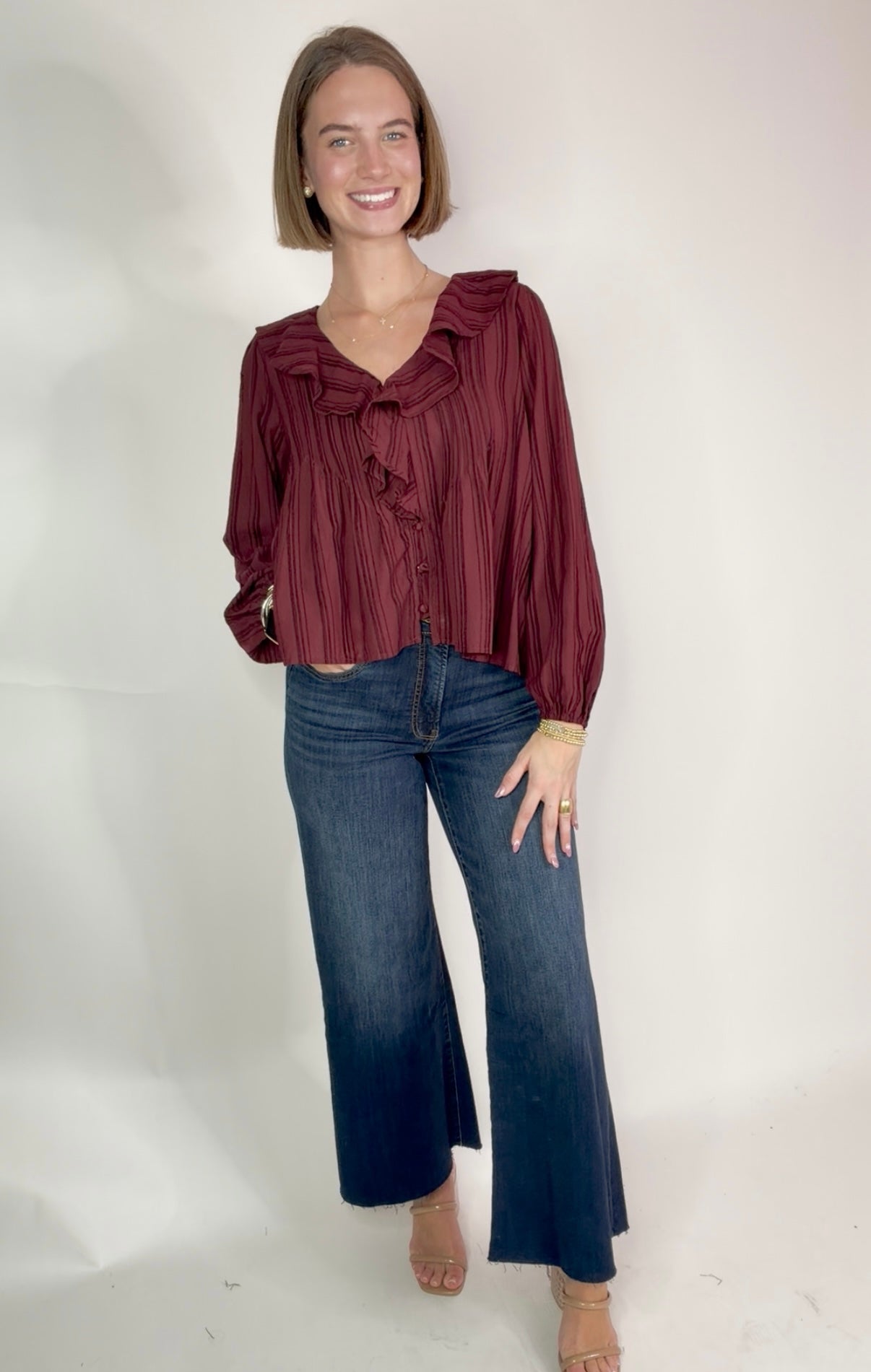 Elevate your wardrobe with The Tatum Ruffle Trim Striped Blouse in Wine, a perfect blend of feminine charm and modern sophistication. The rich wine hue adds warmth and elegance, while subtle vertical stripes create a flattering, elongating effect.