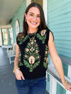 Chic and playful with a touch of nature-inspired charm — The Ryan Short Sleeve Sweater brings effortless style to your everyday wardrobe. Crafted in a soft black knit, this top stands out with its unique green embroidered plant designs that add a fresh, eye-catching twist to a classic silhouette.