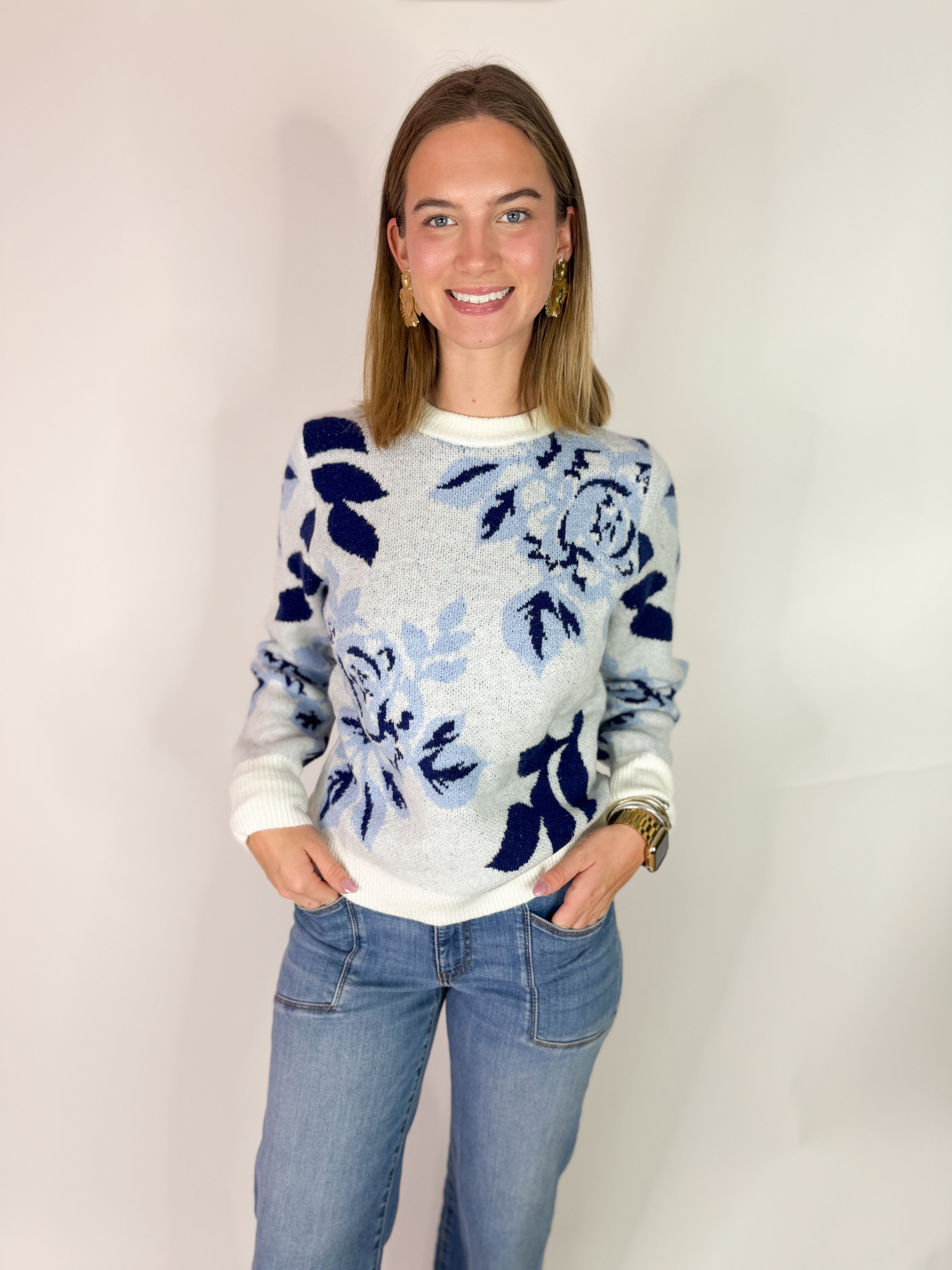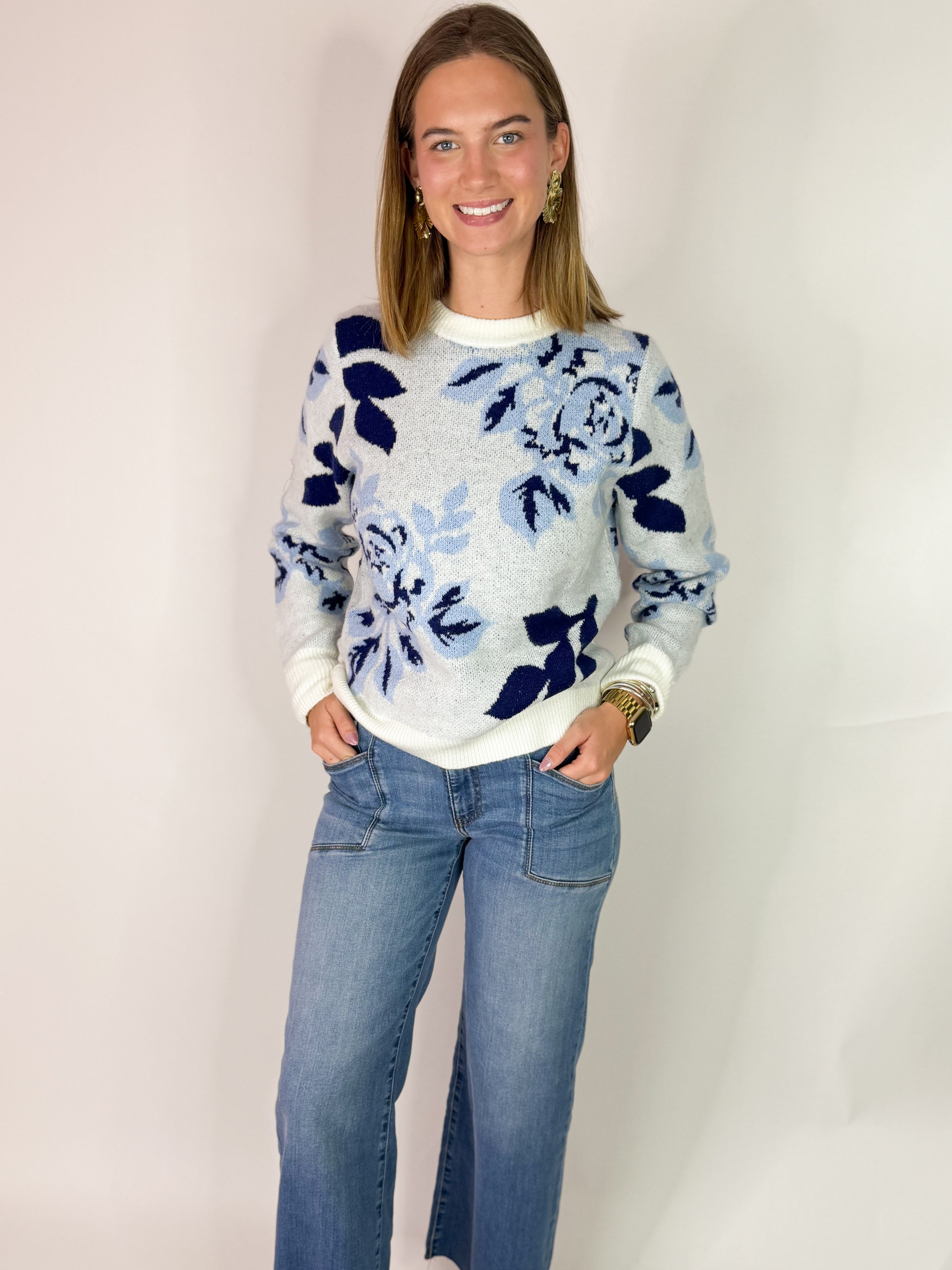 (THML) The Blie Floral Sweater-Blue