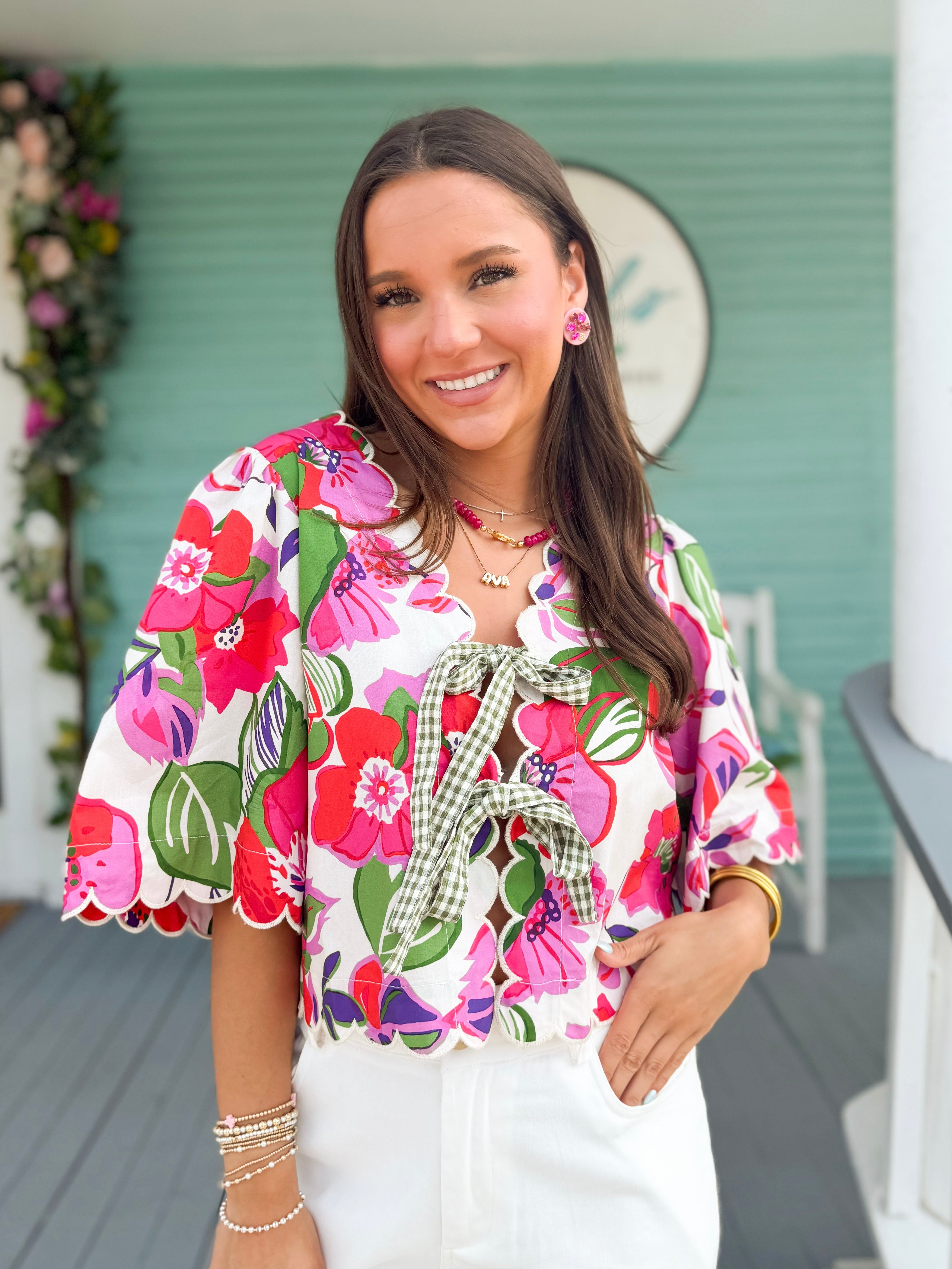 Sweet and feminine, this pink floral top features short sleeves, delicate scalloped details, and a charming tie-front design. The soft floral pattern adds a fresh, romantic touch—perfect for effortless everyday style or dressing up your favorite denim.