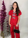 The Arielle features a structured silhouette and a dramatic sequin bow detail that exudes effortless glamour. Its rich red tone adds warmth and depth, making it the perfect top for special occasions, evening events, or chic holiday gatherings.