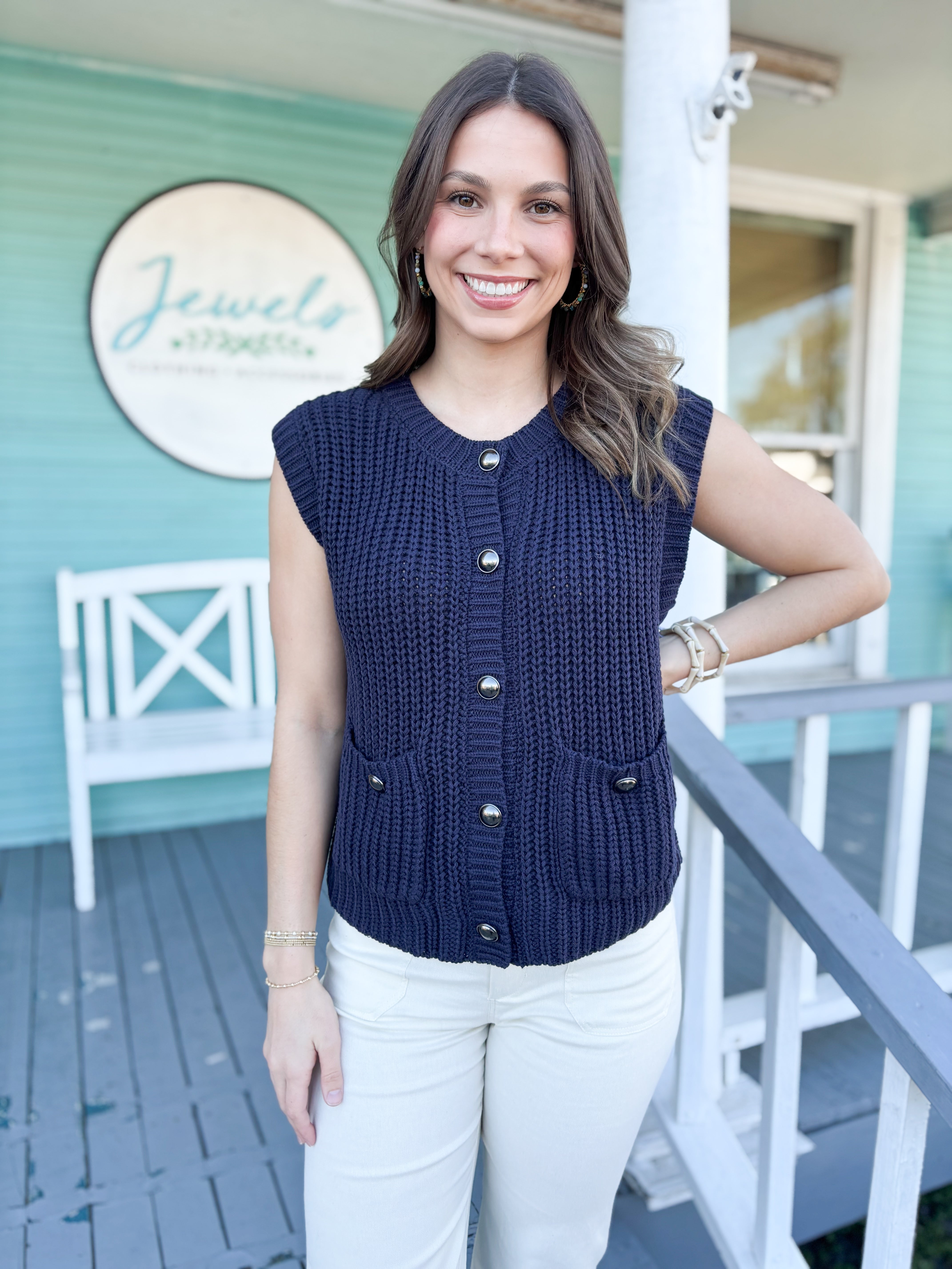 Easy to layer over blouses or lightweight knits, this vest adds warmth and texture to any transitional wardrobe. Whether worn open for a casual drape or buttoned for a structured look, it elevates everyday outfits with soft sophistication.