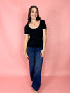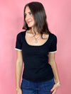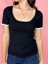 Elevate your cozy style with this black sweater top! Featuring a scoop neckline adorned with delicate pearl trim, it’s the perfect mix of classic comfort and feminine charm — easy to dress up or down.