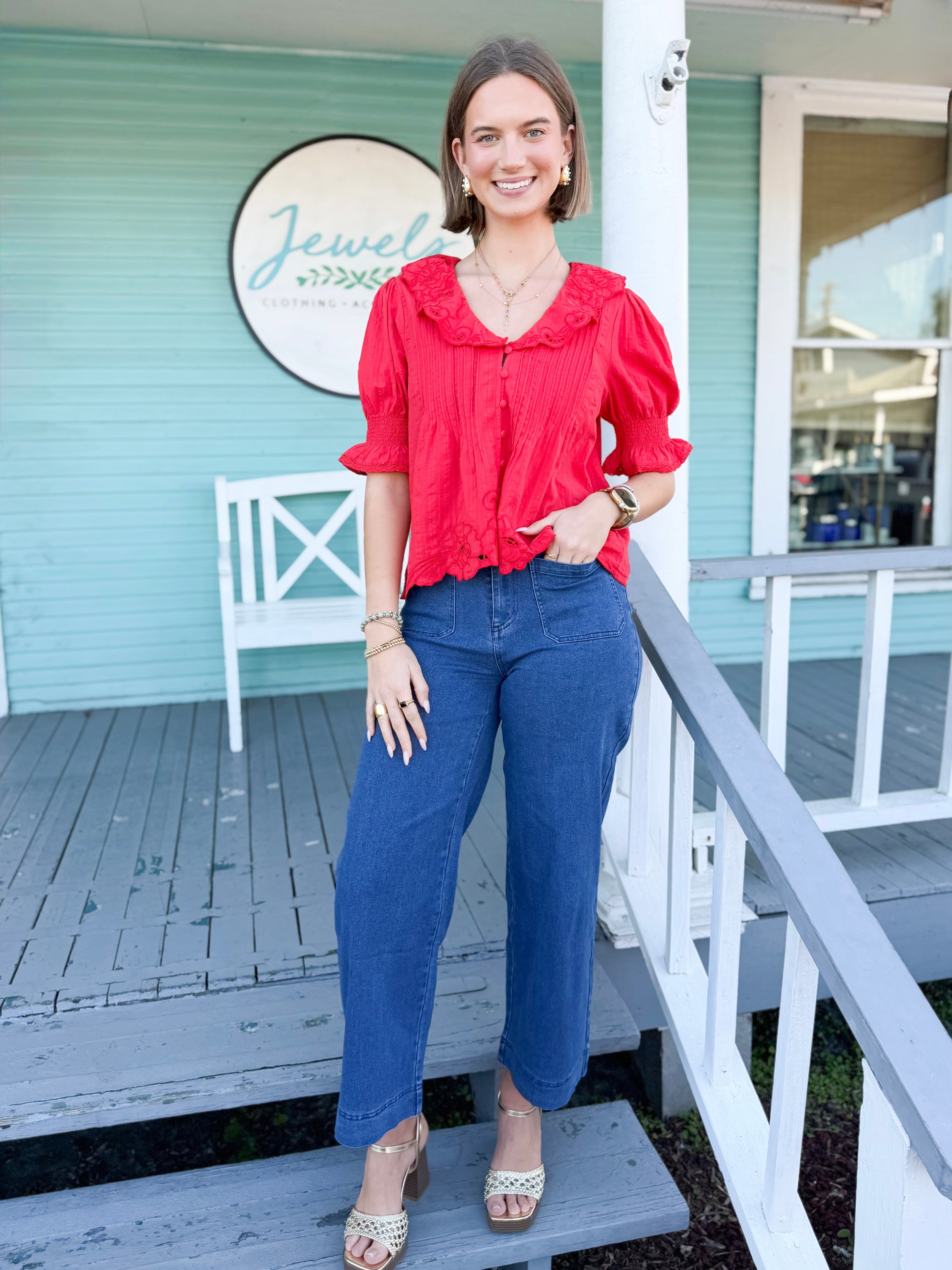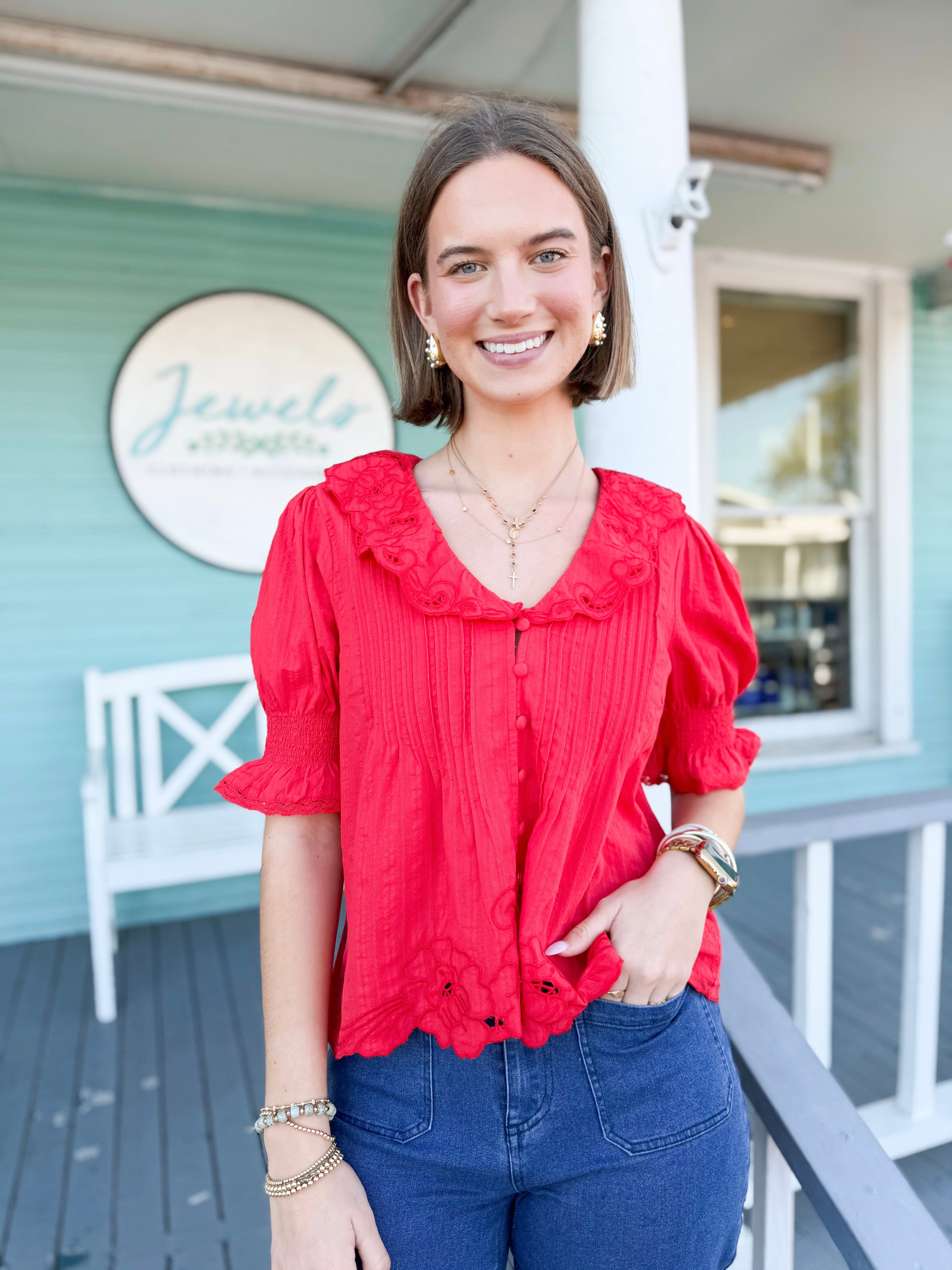 A romantic embroidered blouse designed to capture effortless elegance, featuring a beautifully scalloped collar, delicate pintuck detailing, and feminine smocked sleeves. Crafted from a soft, textured woven fabric, this airy top drapes gracefully for a flowy silhouette that’s perfect for spring and summer. Thoughtful details like covered buttons and an embroidered scalloped hem with cutout accents add a refined, boutique-worthy finish, while the relaxed fit ensures all-day comfort. Easy to dress up or down, it’s a timeless piece you’ll reach for season after season.