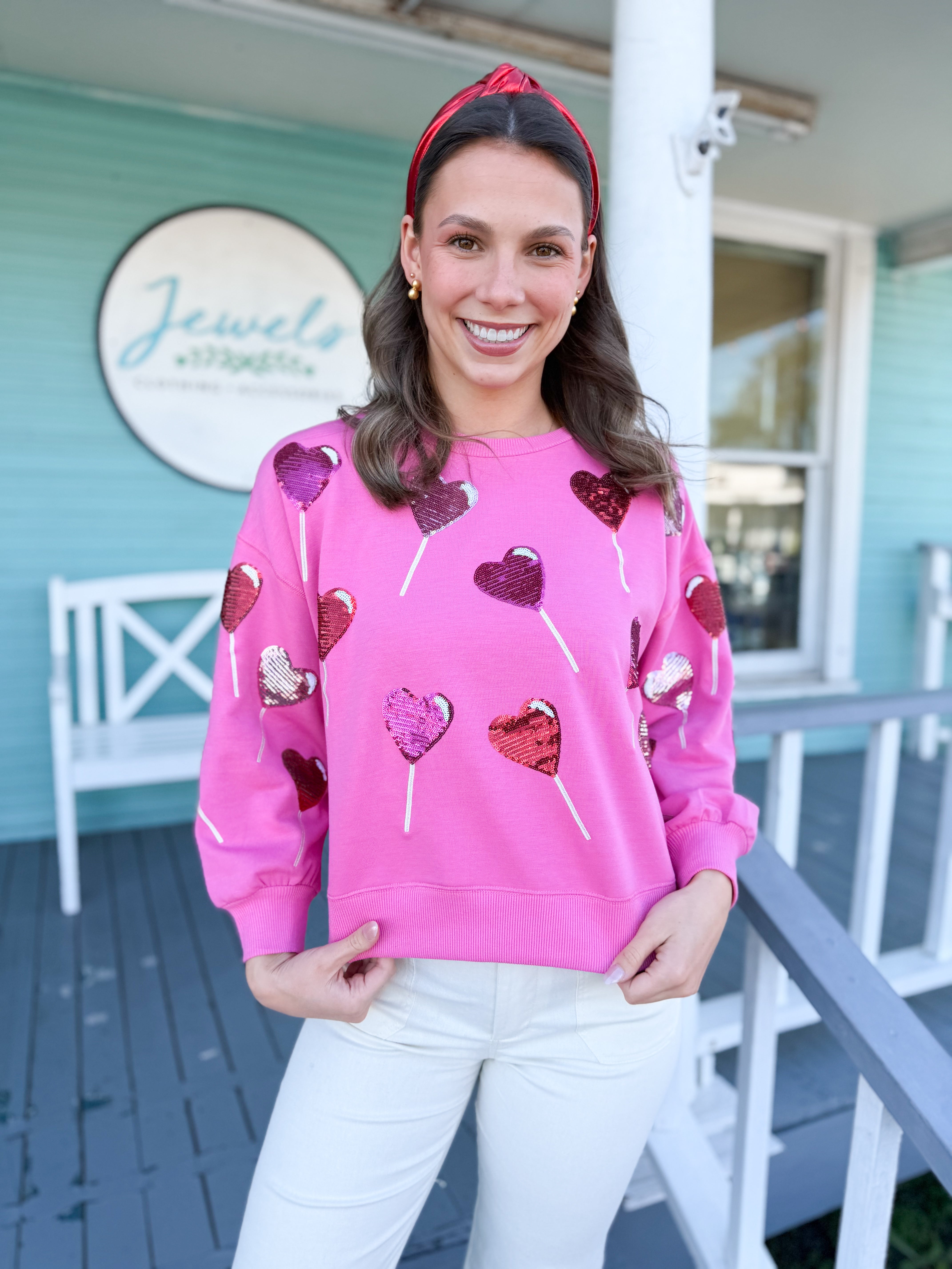 This Pink Sweatshirt adds a sweet sparkle to your casual wardrobe with eye-catching sequin heart lollipop details. Soft, cozy, and fun, it’s perfect for everyday wear when you want a playful pop of shine.