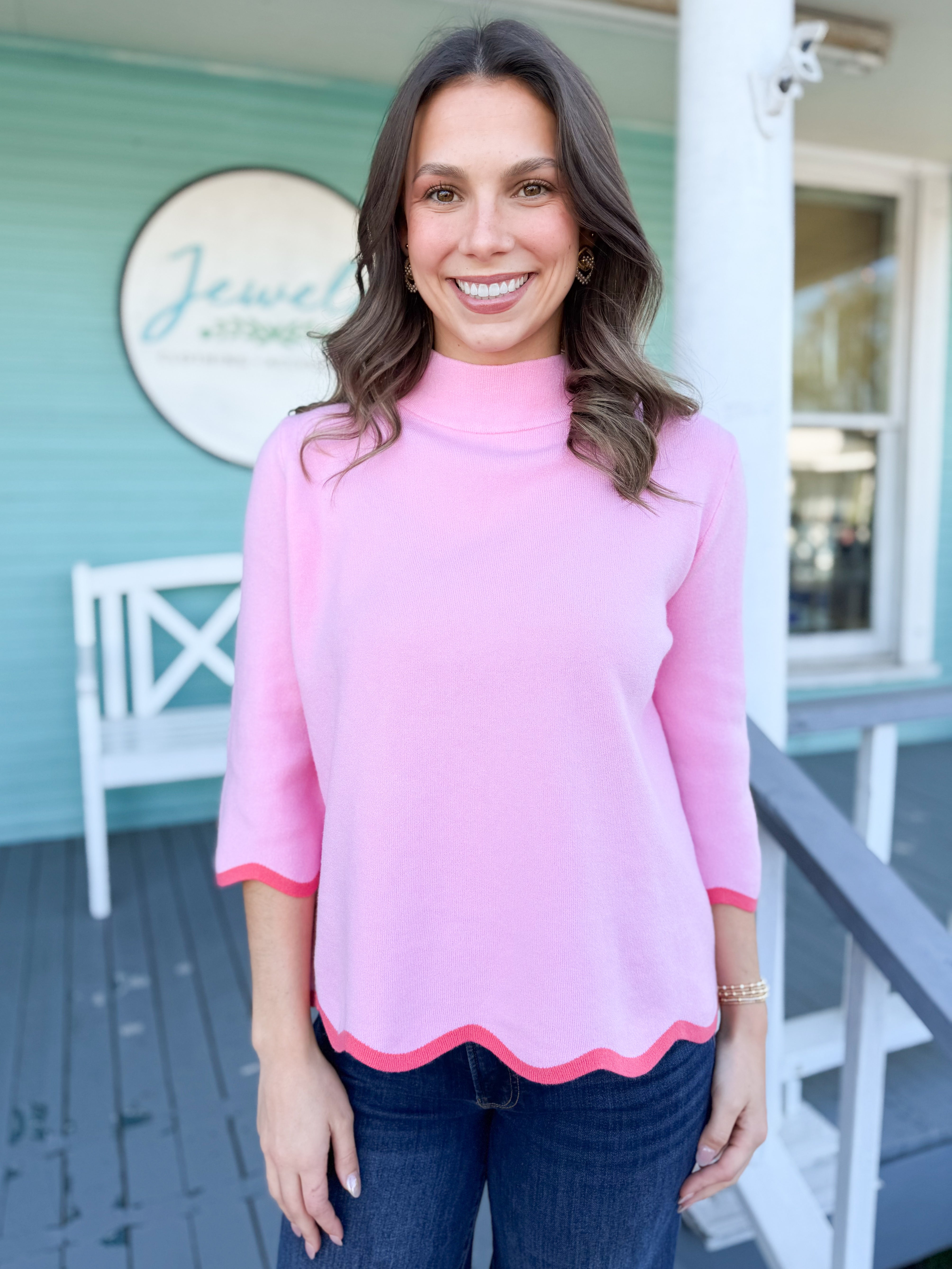 This Scallop-Edge Mock Neck Sweater Top blends cozy comfort with refined detail and is the perfect pop of pink your closet needs. Designed with a flattering mock neckline and finished with elegant scalloped edges, it’s a timeless piece perfect for layering or wearing on its own.