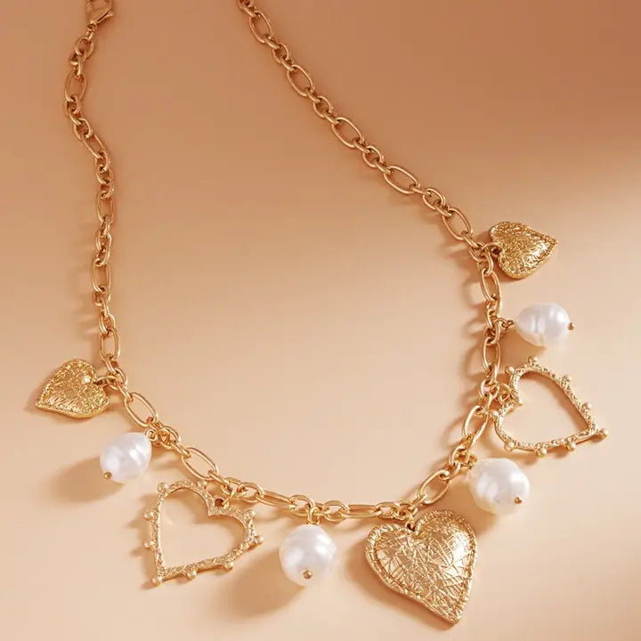This necklace features a 17 inch multi-heart metal charm with a pearl charm cluster. Add a touch of elegance and sophistication to any outfit with this gorgeous and unique piece. Made with high-quality materials, this short necklace is a must-have for any jewelry collection.