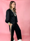 Stay cozy and stylish in this chic set! The long puff sleeve mock-neck top features a Burberry-inspired plaid accent and buttoned cuffs for a polished touch. Paired with elastic waist wide-leg sweatpants with side plaid accents and side pockets, it’s the perfect blend of comfort and elevated style.