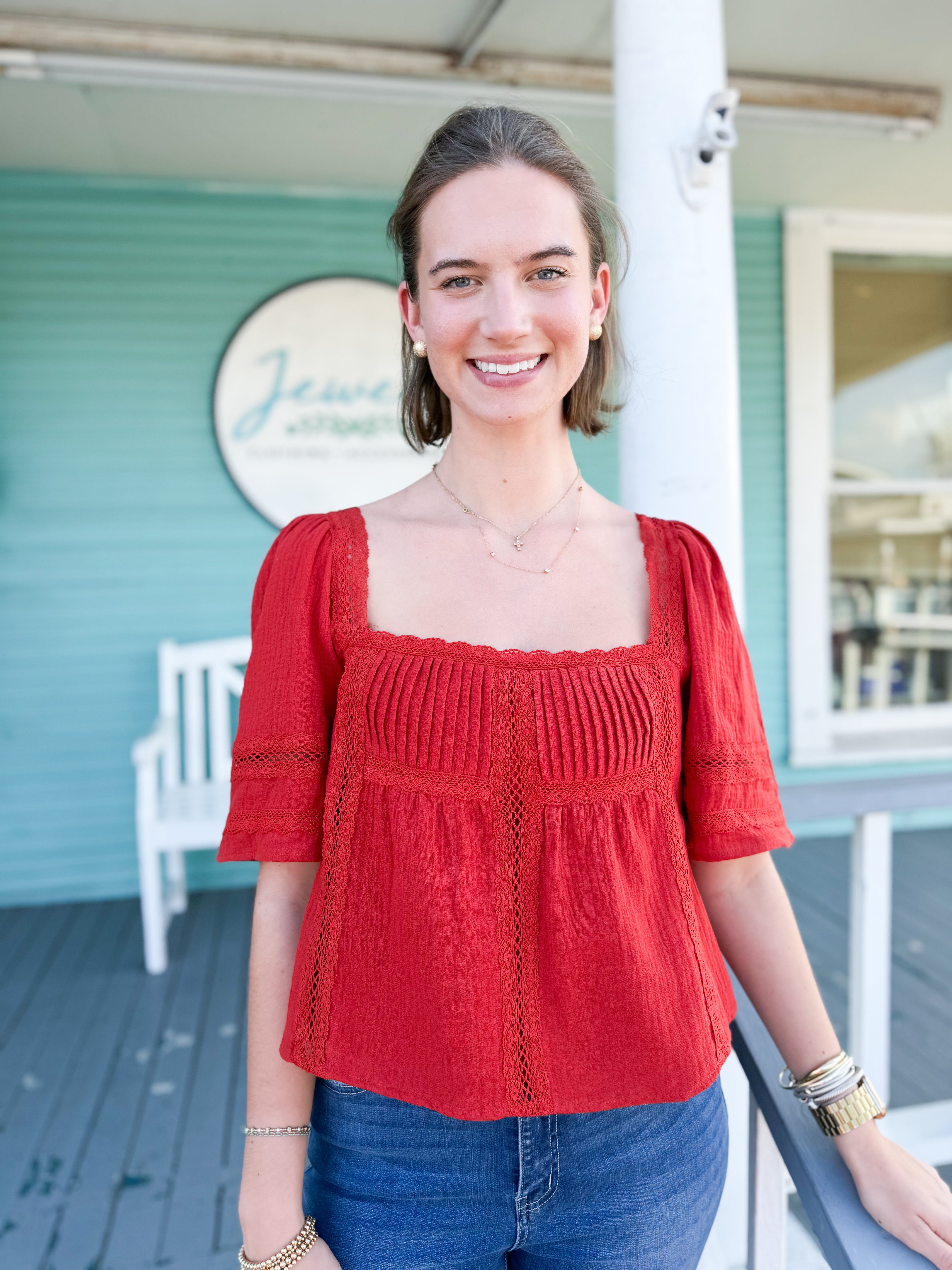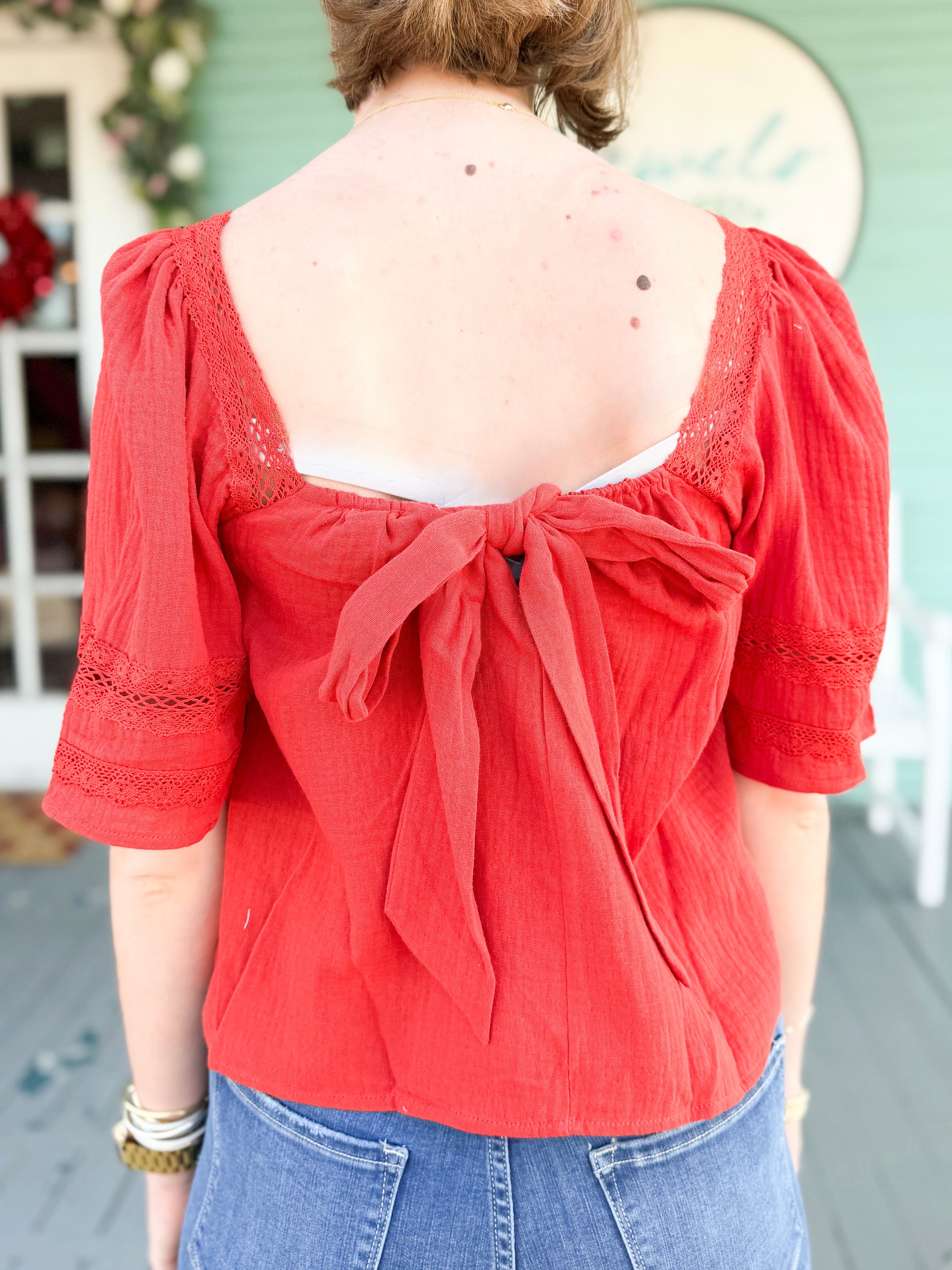 Turn heads in this stunning scarlet blouse. Designed for the girl who loves style and comfort, it features gorgeous lace details, a rich textured fabric, and an effortlessly flattering fit. The sweetest finishing touch? An adorable back bow that makes it unforgettable from every angle.
